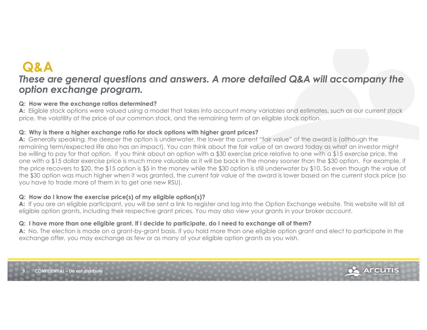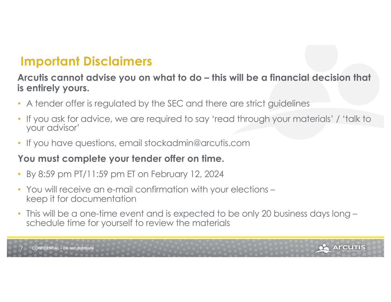 Arcutis cannot advise you on what to do – this will be a financial decision that is entirely yours. • A tender offer is regulated by the SEC and there are strict guidelines • If you ask for advice, we are required to say ‘read through your materials’ / ‘talk to your advisor’ • If you have questions, email stockadmin@arcutis.com You must complete your tender offer on time. • By 8:59 pm PT/11:59 pm ET on February 12, 2024 • You will receive an e-mail confirmation with your elections – keep it for documentation • This will be a one-time event and is expected to be only 20 business days long – schedule time for yourself to review the materials 7 CONFIDENTIAL – Do not distribute Important Disclaimers