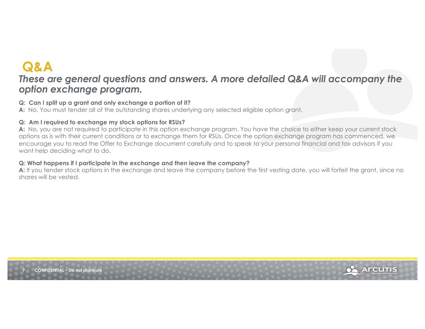 These are general questions and answers. A more detailed Q&A will accompany the option exchange program. Q: How were the exchange ratios determined? A: Eligible stock options were valued using a model that takes into account many variables and estimates, such as our current stock price, the volatility of the price of our common stock, and the remaining term of an eligible stock option. Q: Why is there a higher exchange ratio for stock options with higher grant prices? A: Generally speaking, the deeper the option is underwater, the lower the current “fair value” of the award is (although the remaining term/expected life also has an impact). You can think about the fair value of an award today as what an investor might be willing to pay for that option. If you think about an option with a $30 exercise price relative to one with a $15 exercise price, the one with a $15 dollar exercise price is much more valuable as it will be back in the money sooner than the $30 option. For example, if the price recovers to $20, the $15 option is $5 in the money while the $30 option is still underwater by $10. So even though the value of the $30 option was much higher when it was granted, the current fair value of the award is lower based on the current stock price (so you have to trade more of them in to get one new RSU). Q: How do I know the exercise price(s) of my eligible option(s)? A: If you are an eligible participant, you will be sent a link to register and log into the Option Exchange website. This website will list all eligible option grants, including their respective grant prices. You may also view your grants in your broker account. Q: I have more than one eligible grant. If I decide to participate, do I need to exchange all of them? A: No. The election is made on a grant-by-grant basis. If you hold more than one eligible option grant and elect to participate in the exchange offer, you may exchange as few or as many of your eligible option grants as you wish. 8 CONFIDENTIAL – Do not distribute Q&A
