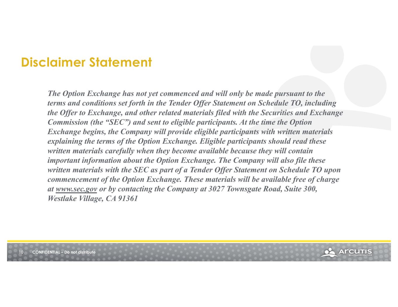 10 The Option Exchange has not yet commenced and will only be made pursuant to the terms and conditions set forth in the Tender Offer Statement on Schedule TO, including the Offer to Exchange, and other related materials filed with the Securities and Exchange Commission (the “SEC”) and sent to eligible participants. At the time the Option Exchange begins, the Company will provide eligible participants with written materials explaining the terms of the Option Exchange. Eligible participants should read these written materials carefully when they become available because they will contain important information about the Option Exchange. The Company will also file these written materials with the SEC as part of a Tender Offer Statement on Schedule TO upon commencement of the Option Exchange. These materials will be available free of charge at www.sec.gov or by contacting the Company at 3027 Townsgate Road, Suite 300, Westlake Village, CA 91361 Disclaimer Statement CONFIDENTIAL – Do not distribute