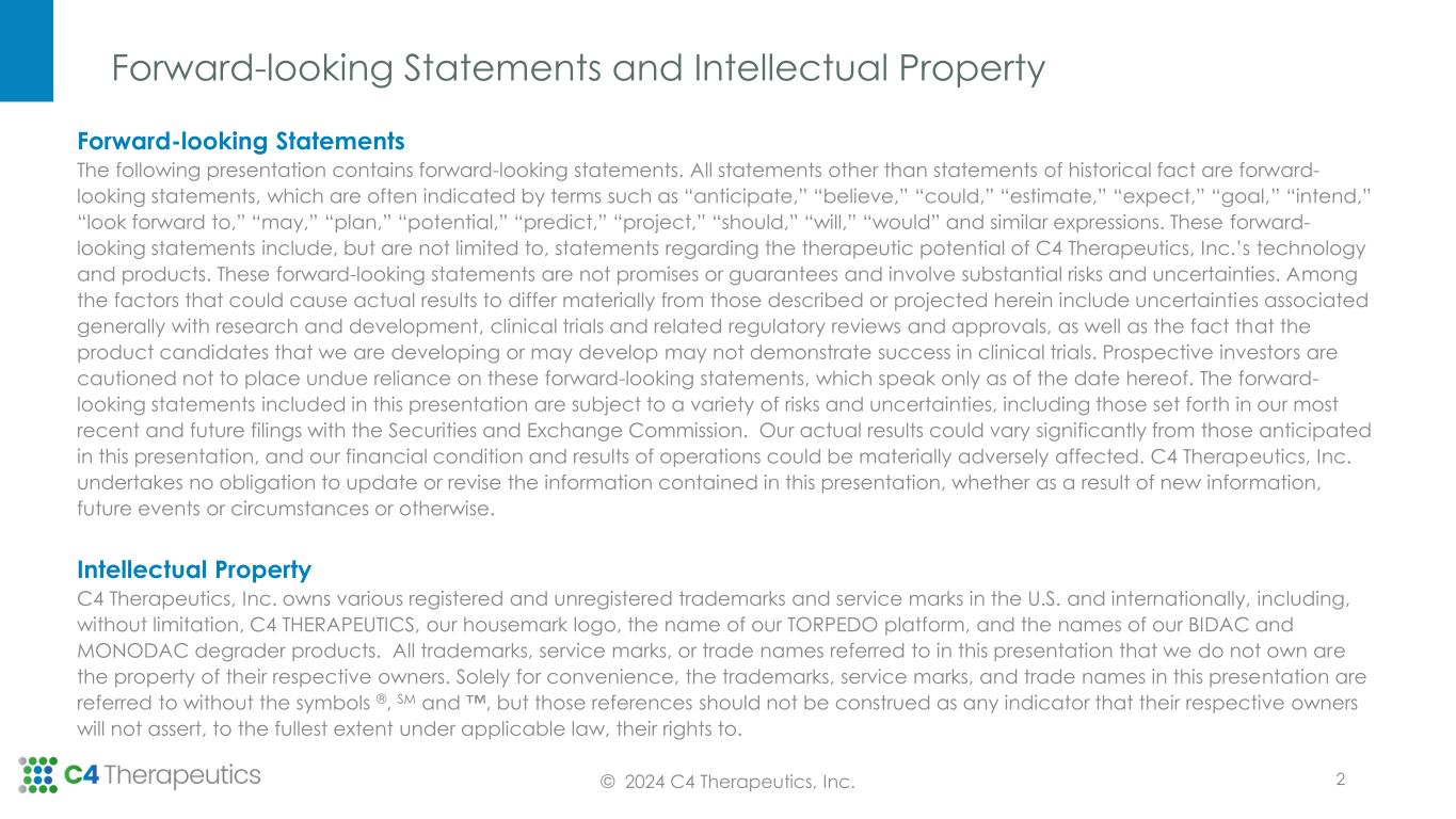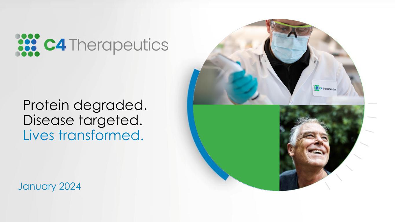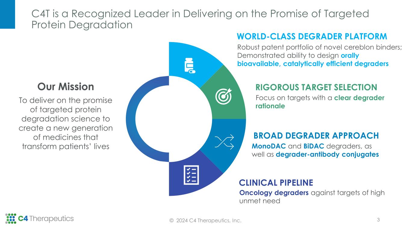 Forward-looking Statements and Intellectual Property 2 Forward-looking Statements The following presentation contains forward-looking statements. All statements other than statements of historical fact are forward- looking statements, which are often indicated by terms such as “anticipate,” “believe,” “could,” “estimate,” “expect,” “goal,” “intend,” “look forward to,” “may,” “plan,” “potential,” “predict,” “project,” “should,” “will,” “would” and similar expressions. These forward- looking statements include, but are not limited to, statements regarding the therapeutic potential of C4 Therapeutics, Inc.’s technology and products. These forward-looking statements are not promises or guarantees and involve substantial risks and uncertainties. Among the factors that could cause actual results to differ materially from those described or projected herein include uncertainties associated generally with research and development, clinical trials and related regulatory reviews and approvals, as well as the fact that the product candidates that we are developing or may develop may not demonstrate success in clinical trials. Prospective investors are cautioned not to place undue reliance on these forward-looking statements, which speak only as of the date hereof. The forward- looking statements included in this presentation are subject to a variety of risks and uncertainties, including those set forth in our most recent and future filings with the Securities and Exchange Commission. Our actual results could vary significantly from those anticipated in this presentation, and our financial condition and results of operations could be materially adversely affected. C4 Therapeutics, Inc. undertakes no obligation to update or revise the information contained in this presentation, whether as a result of new information, future events or circumstances or otherwise. Intellectual Property C4 Therapeutics, Inc. owns various registered and unregistered trademarks and service marks in the U.S. and internationally, including, without limitation, C4 THERAPEUTICS, our housemark logo, the name of our TORPEDO platform, and the names of our BIDAC and MONODAC degrader products. All trademarks, service marks, or trade names referred to in this presentation that we do not own are the property of their respective owners. Solely for convenience, the trademarks, service marks, and trade names in this presentation are referred to without the symbols ®, SM and , but those references should not be construed as any indicator that their respective owners will not assert, to the fullest extent under applicable law, their rights to. © 2024 C4 Therapeutics, Inc.