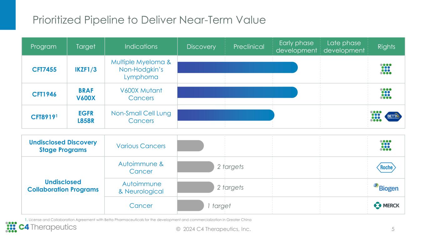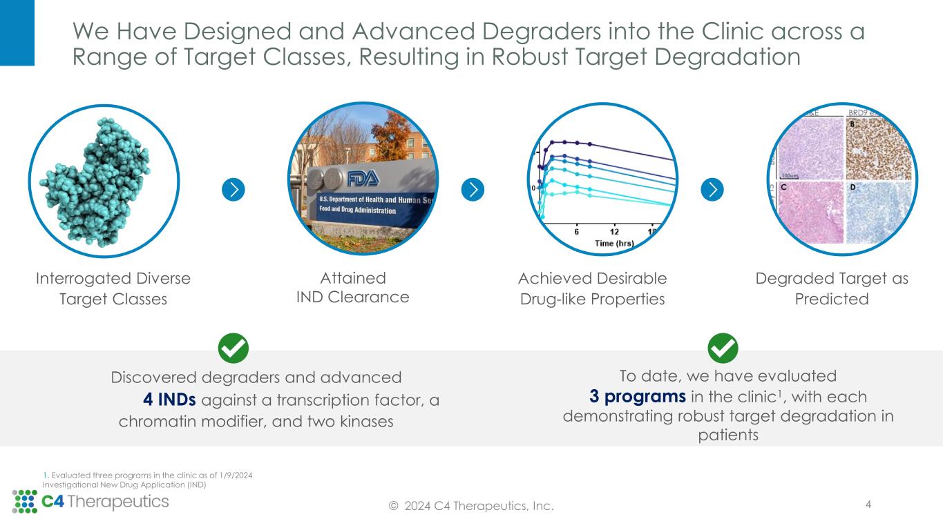 We Have Designed and Advanced Degraders into the Clinic across a Range of Target Classes, Resulting in Robust Target Degradation © 2024 C4 Therapeutics, Inc. Degraded Target as Predicted Interrogated Diverse Target Classes Attained IND Clearance Achieved Desirable Drug-like Properties 1. Evaluated three programs in the clinic as of 1/9/2024 Investigational New Drug Application (IND) Discovered degraders and advanced 4 INDs against a transcription factor, a chromatin modifier, and two kinases To date, we have evaluated 3 programs in the clinic1, with each demonstrating robust target degradation in patients 4