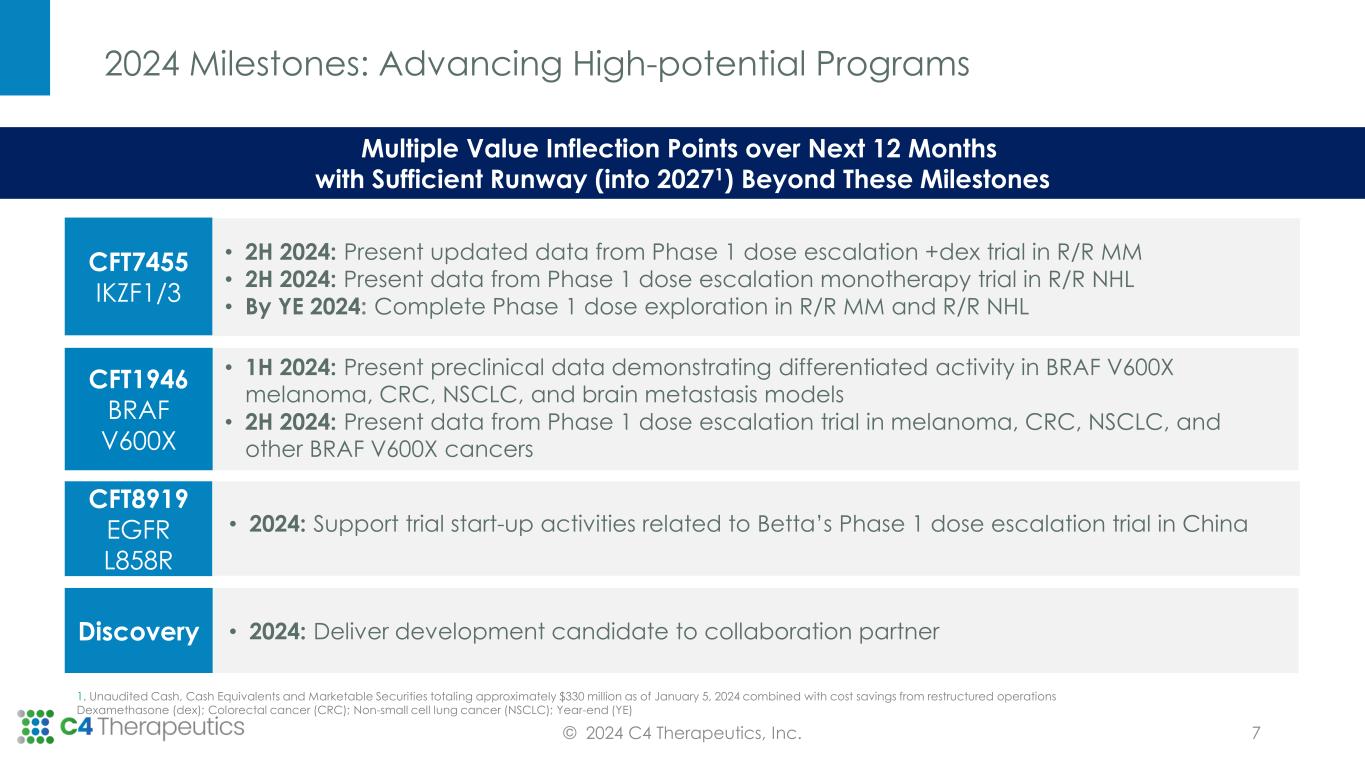 Capital1 from ATM, Betta Equity, and Merck Upfront Combined with Cost Savings from Restructuring Extends Cash Runway into 2027 2023 Accomplishments Position C4T for Future Value Creation © 2024 C4 Therapeutics, Inc. ✓ Presented positive CFT7455 Phase 1 dose escalation data in R/R MM demonstrating new optimal schedule and encouraging IMWG responses in + dex arm ✓ Dosed first patient in CFT1946 Phase 1/2 trial and completed enrollment in 3 escalation cohorts ✓ Presented new CFT1946 preclinical data demonstrating superiority to inhibitors in in vivo models of BRAF V600X driven disease and in escape mutant models ✓ Generated CFT8634 data to inform portfolio decision to stop program development ✓ Secured China partnership for CFT8919 and achieved FDA clearance of U.S. IND and CTA clearance from China’s NMPA ✓ Entered into collaboration with Merck to discover and develop degrader-antibody conjugates 6 1. Approximately $107M of new capital is comprised of the previously announced $25M equity investment from a subsidiary of Betta Pharmaceuticals, the $10M upfront payment from collaborator Merck for the Degrader-Antibody Conjugate collaboration and approximately $72M in net proceeds generated by leveraging the company’s at-the-market (or ATM) facility during the fourth quarter of 2023 International Myeloma Work Group (IMWG); Dexamethasone (dex); Investigational New Drug (IND); Clinical Trial Application (CTA); National Medical Products Administration (NMPA) Strong Execution on 2023 Milestones