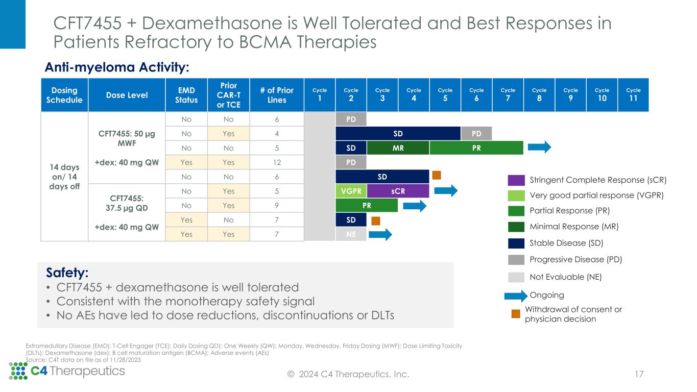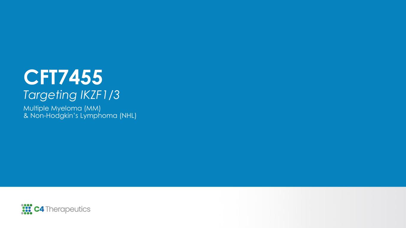 Potential for further dose escalation CFT7455: 62.5 µg QD +dex: 40 mg QW* N= ~4 Currently enrolling CFT7455: 37.5 µg QD +dex: 40 mg QW* N=4 CFT7455: 50 µg; MWF +dex: 40 mg QW* N=5 CFT7455 + Dexamethasone Dose Escalation in R/R MM Continues to Progress © 2024 C4 Therapeutics, Inc. Phase 1: Dose Escalation + Dexamethasone 14 Days On/14 Days Off CFT7455: 62.5 µg QD +dex: 40 mg QW* N = ≤10 Phase 1 dose expansion cohort to open Phase 2: Cohort Expansion N=~30 Eastern Cooperative Oncology Group (ECOG), Monday, Wednesday, Friday dosing (MWF); Daily Dosing (QD), Relapsed/Refractory multiple myeloma (R/R MM); Absolute neutrophil count (ANC); Hemoglobin (Hgb); Dexamethasone (Dex) *+Dex is dosed on days 1, 8,15, and 22 and dose is reduced for older patients. Source: C4T data on file as of 11/28/2023 KEY INCLUSION CRITERIA • Adults with R/R MM, at least 3 prior lines that have included lenalidomide, pomalidomide, a proteasome inhibitor, a glucocorticoid, and an anti-CD38 monoclonal antibody • Nonresponsive to or progressed within 60 days of prior therapy • Measurable disease • Adequate bone marrow function (ANC ≥1000, Hgb ≥8.0, platelets ≥75,000) • Creatinine clearance ≥40 mL/min • ECOG ≤2 CFT7455: 37.5 µg QD +dex: 40 mg QW* N = ≤10 Phase 1 dose expansion currently enrolling 16