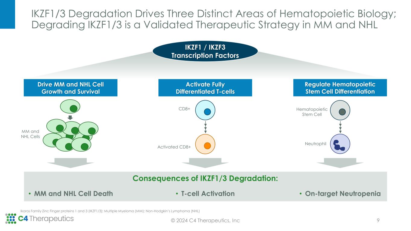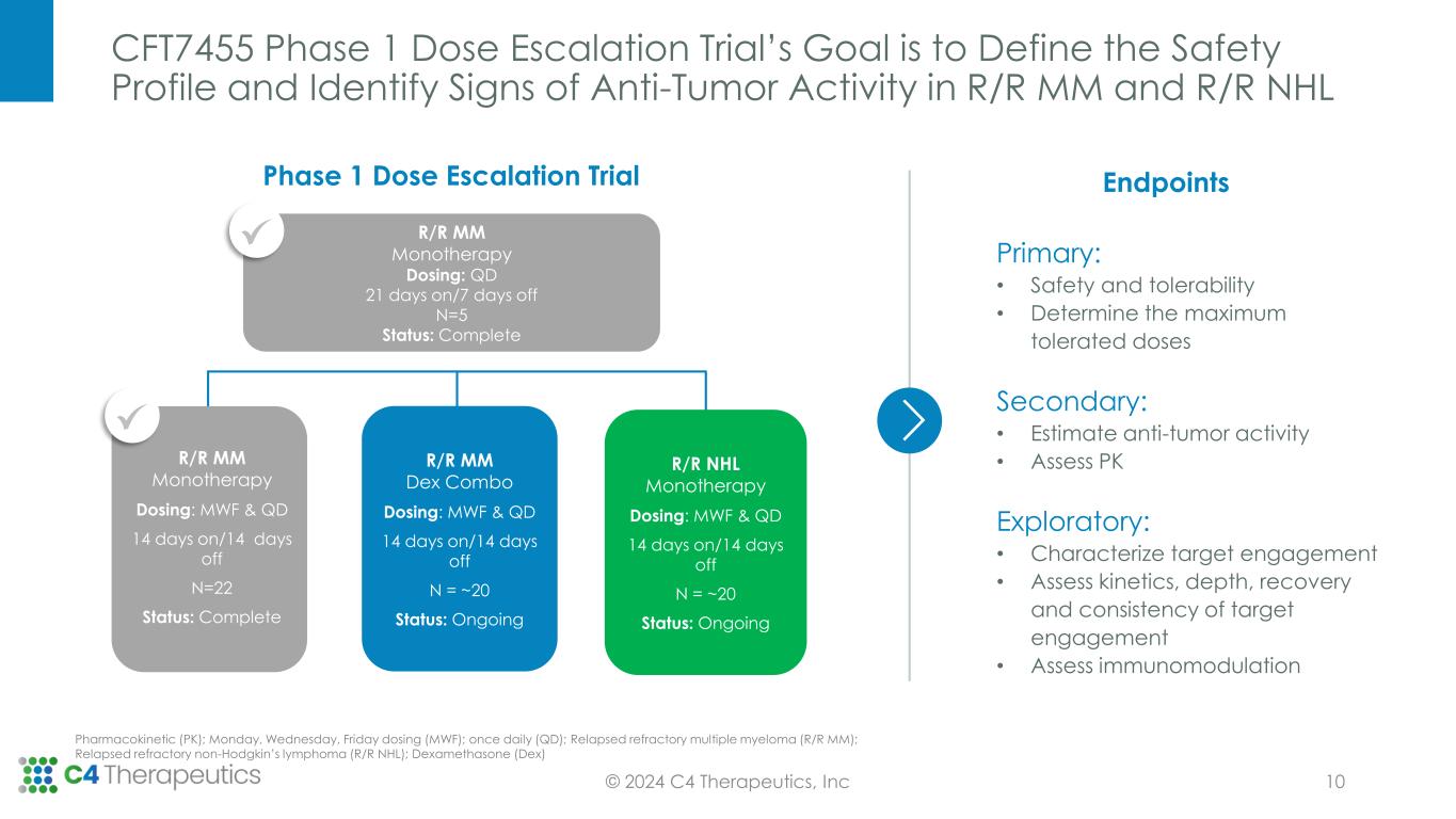 IKZF1/3 Degradation Drives Three Distinct Areas of Hematopoietic Biology; Degrading IKZF1/3 is a Validated Therapeutic Strategy in MM and NHL Ikaros Family Zinc Finger proteins 1 and 3 (IKZF1/3); Multiple Myeloma (MM); Non-Hodgkin’s Lymphoma (NHL) © 2024 C4 Therapeutics, Inc IKZF1 / IKZF3 Transcription Factors Hematopoietic Stem Cell Neutrophil Drive MM and NHL Cell Growth and Survival Activate Fully Differentiated T-cells Regulate Hematopoietic Stem Cell Differentiation Consequences of IKZF1/3 Degradation: • MM and NHL Cell Death • T-cell Activation • On-target Neutropenia CD8+ Activated CD8+ MM and NHL Cells 9