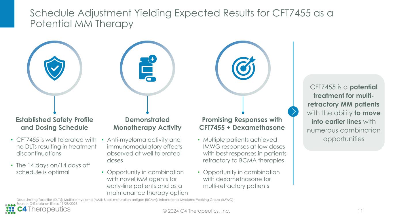 R/R MM Monotherapy Dosing: QD 21 days on/7 days off N=5 Status: Complete CFT7455 Phase 1 Dose Escalation Trial’s Goal is to Define the Safety Profile and Identify Signs of Anti-Tumor Activity in R/R MM and R/R NHL Pharmacokinetic (PK); Monday, Wednesday, Friday dosing (MWF); once daily (QD); Relapsed refractory multiple myeloma (R/R MM); Relapsed refractory non-Hodgkin’s lymphoma (R/R NHL); Dexamethasone (Dex) Phase 1 Dose Escalation Trial Primary: • Safety and tolerability • Determine the maximum tolerated doses Secondary: • Estimate anti-tumor activity • Assess PK Exploratory: • Characterize target engagement • Assess kinetics, depth, recovery and consistency of target engagement • Assess immunomodulation R/R MM Monotherapy Dosing: MWF & QD 14 days on/14 days off N=22 Status: Complete R/R MM Dex Combo Dosing: MWF & QD 14 days on/14 days off N = ~20 Status: Ongoing R/R NHL Monotherapy Dosing: MWF & QD 14 days on/14 days off N = ~20 Status: Ongoing Endpoints © 2024 C4 Therapeutics, Inc 10