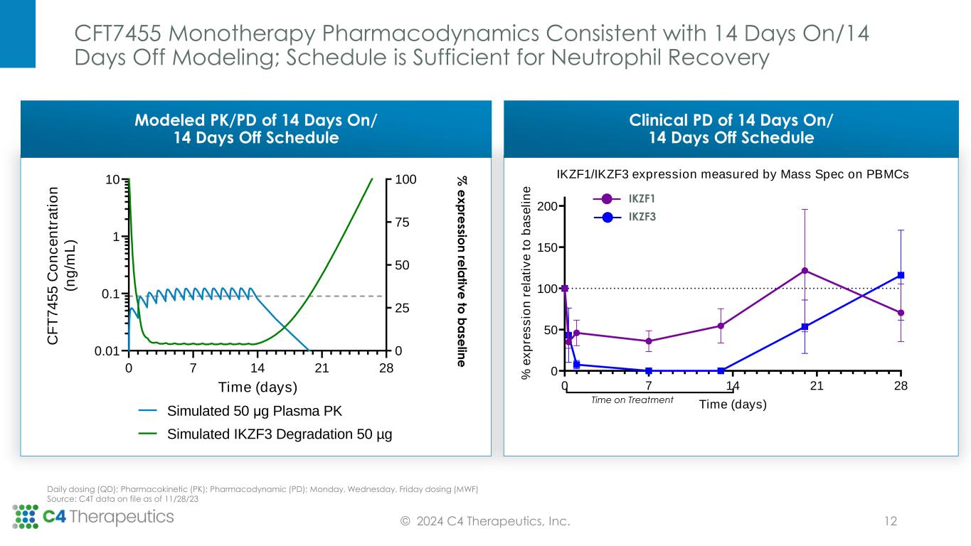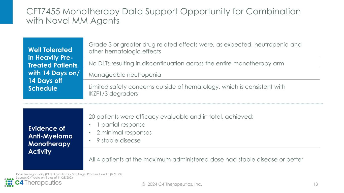 CFT7455 Monotherapy Pharmacodynamics Consistent with 14 Days On/14 Days Off Modeling; Schedule is Sufficient for Neutrophil Recovery Daily dosing (QD); Pharmacokinetic (PK); Pharmacodynamic (PD); Monday, Wednesday, Friday dosing (MWF) Source: C4T data on file as of 11/28/23 © 2024 C4 Therapeutics, Inc. 0 7 14 21 28 0.01 0.1 1 10 0 25 50 75 100 Time (days) C F T 7 4 5 5 C o n c e n tr a ti o n (n g /m L ) IK Z F 3 T is s u e D e g ra d a tio n (% ) Simulated IKZF3 Degradation 50 µg Simulated 50 μg Plasma PK Modeled PK/PD of 14 Days On/ 14 Days Off Schedule % e x p re ssio n re la tiv e to b a se lin e Clinical PD of 14 Days On/ 14 Days Off Schedule 0 7 14 21 28 0 50 100 150 200 IKZF1/IKZF3 expression measured by Mass Spec on PBMCs Time (days) % e x p re s s io n r e la ti v e t o b a s e li n e Time on Treatment IKZF1 IKZF3 12