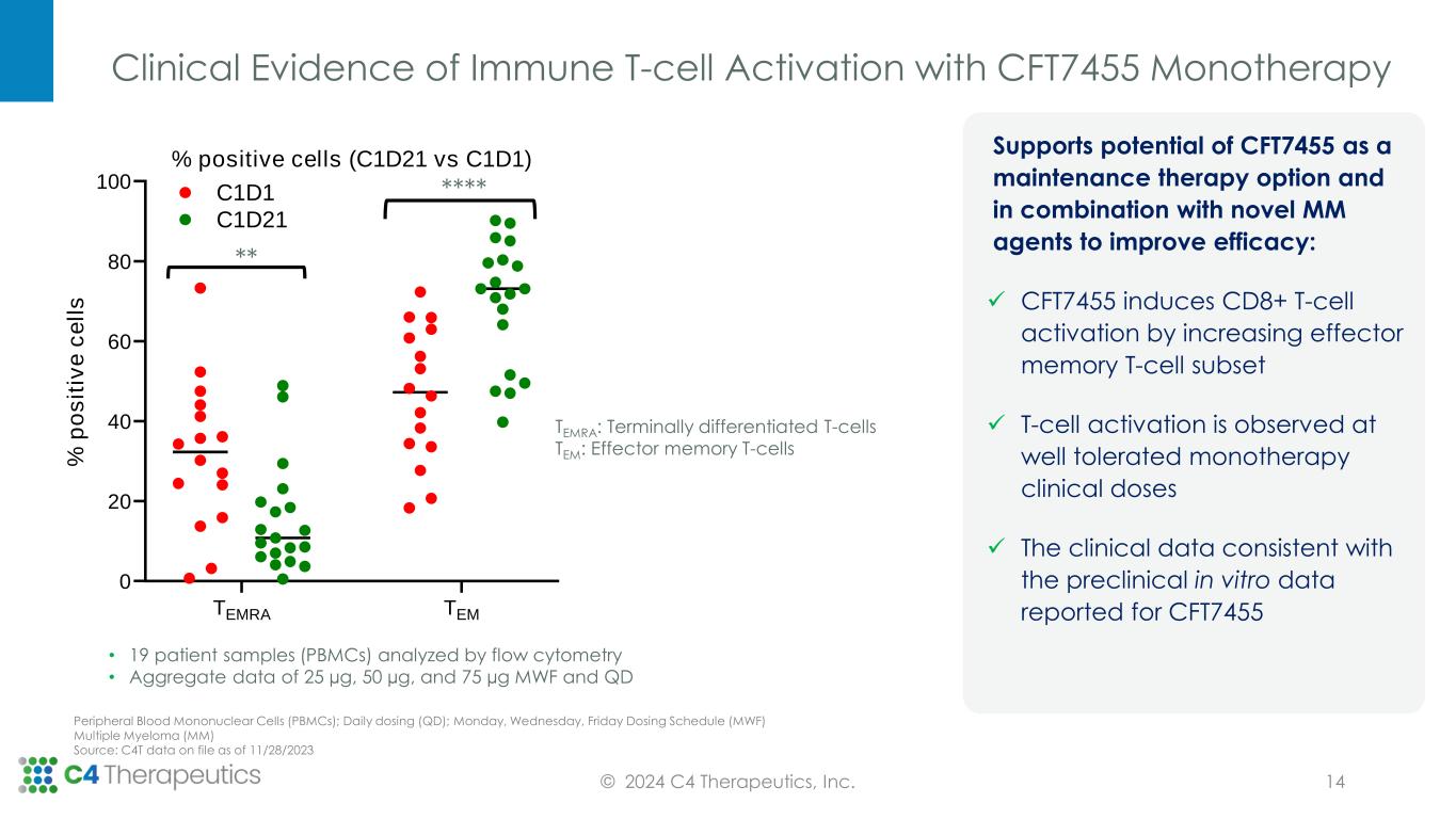 CFT7455 Monotherapy Data Support Opportunity for Combination with Novel MM Agents © 2024 C4 Therapeutics, Inc. 13 Evidence of Anti-Myeloma Monotherapy Activity 20 patients were efficacy evaluable and in total, achieved: • 1 partial response • 2 minimal responses • 9 stable disease All 4 patients at the maximum administered dose had stable disease or better Well Tolerated in Heavily Pre- Treated Patients with 14 Days on/ 14 Days off Schedule Grade 3 or greater drug related effects were, as expected, neutropenia and other hematologic effects No DLTs resulting in discontinuation across the entire monotherapy arm Manageable neutropenia Limited safety concerns outside of hematology, which is consistent with IKZF1/3 degraders Dose limiting toxicity (DLT); Ikaros Family Zinc Finger Proteins 1 and 3 (IKZF1/3) Source: C4T data on file as of 11/28/2023