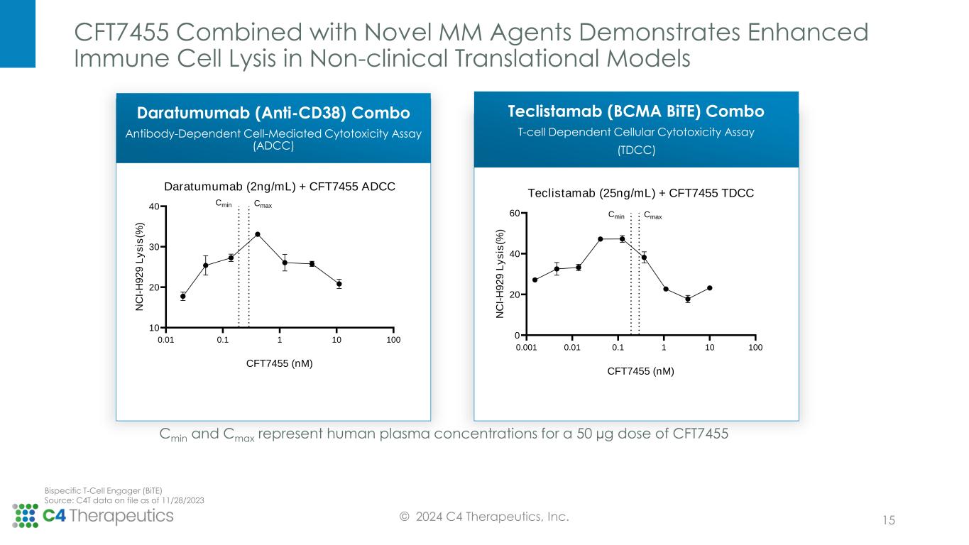 TEMRA TEM 0 20 40 60 80 100 % positive cells (C1D21 vs C1D1) % p o s it iv e c e ll s C1D1 C1D21 © 2024 C4 Therapeutics, Inc. Clinical Evidence of Immune T-cell Activation with CFT7455 Monotherapy ** **** TEMRA: Terminally differentiated T-cells TEM: Effector memory T-cells Peripheral Blood Mononuclear Cells (PBMCs); Daily dosing (QD); Monday, Wednesday, Friday Dosing Schedule (MWF) Multiple Myeloma (MM) Source: C4T data on file as of 11/28/2023 • 19 patient samples (PBMCs) analyzed by flow cytometry • Aggregate data of 25 µg, 50 µg, and 75 µg MWF and QD Supports potential of CFT7455 as a maintenance therapy option and in combination with novel MM agents to improve efficacy: ✓ CFT7455 induces CD8+ T-cell activation by increasing effector memory T-cell subset ✓ T-cell activation is observed at well tolerated monotherapy clinical doses ✓ The clinical data consistent with the preclinical in vitro data reported for CFT7455 14