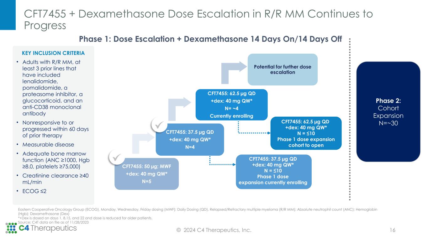 CFT7455 Combined with Novel MM Agents Demonstrates Enhanced Immune Cell Lysis in Non-clinical Translational Models Bispecific T-Cell Engager (BiTE) Source: C4T data on file as of 11/28/2023 Cmin and Cmax represent human plasma concentrations for a 50 µg dose of CFT7455 Daratumumab (Anti-CD38) Combo Antibody-Dependent Cell-Mediated Cytotoxicity Assay (ADCC) 0.001 0.01 0.1 1 10 100 0 20 40 60 Teclistamab (25ng/mL) + CFT7455 TDCC CFT7455 (nM) N C I- H 9 2 9 L y s is (% ) Cmin Cmax 0.01 0.1 1 10 100 10 20 30 40 Daratumumab (2ng/mL) + CFT7455 ADCC CFT7455 (nM) N C I- H 9 2 9 L y s is (% ) Cmin Cmax Teclistamab (BCMA BiTE) Combo T-cell Dependent Cellular Cytotoxicity Assay (TDCC) © 2024 C4 Therapeutics, Inc. 15