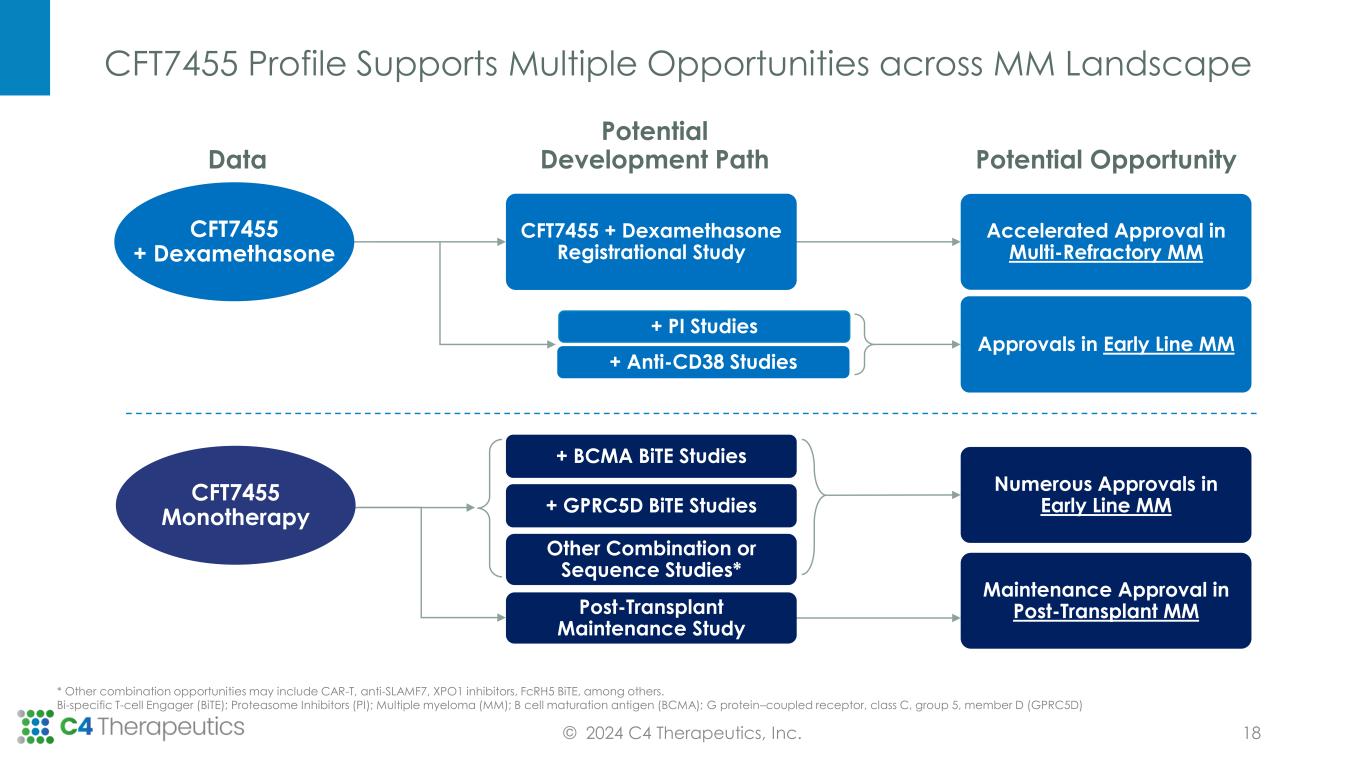 Dosing Schedule Dose Level EMD Status Prior CAR-T or TCE # of Prior Lines Cycle 1 Cycle 2 Cycle 3 Cycle 4 Cycle 5 Cycle 6 Cycle 7 Cycle 8 Cycle 9 Cycle 10 Cycle 11 14 days on/ 14 days off CFT7455: 50 µg MWF +dex: 40 mg QW No No 6 PD No Yes 4 SD PD No No 5 SD MR PR Yes Yes 12 PD No No 6 SD CFT7455: 37.5 µg QD +dex: 40 mg QW No Yes 5 VGPR sCR No Yes 9 PR Yes No 7 SD Yes Yes 7 NE CFT7455 + Dexamethasone is Well Tolerated and Best Responses in Patients Refractory to BCMA Therapies Stable Disease (SD) Progressive Disease (PD) Minimal Response (MR) Not Evaluable (NE) Withdrawal of consent or physician decision Ongoing Partial Response (PR) Very good partial response (VGPR) Stringent Complete Response (sCR) Extramedullary Disease (EMD); T-Cell Engager (TCE); Daily Dosing QD); One Weekly (QW); Monday, Wednesday, Friday Dosing (MWF); Dose Limiting Toxicity (DLTs); Dexamethasone (dex); B cell maturation antigen (BCMA); Adverse events (AEs) Source: C4T data on file as of 11/28/2023 © 2024 C4 Therapeutics, Inc. Safety: • CFT7455 + dexamethasone is well tolerated • Consistent with the monotherapy safety signal • No AEs have led to dose reductions, discontinuations or DLTs Anti-myeloma Activity: 17