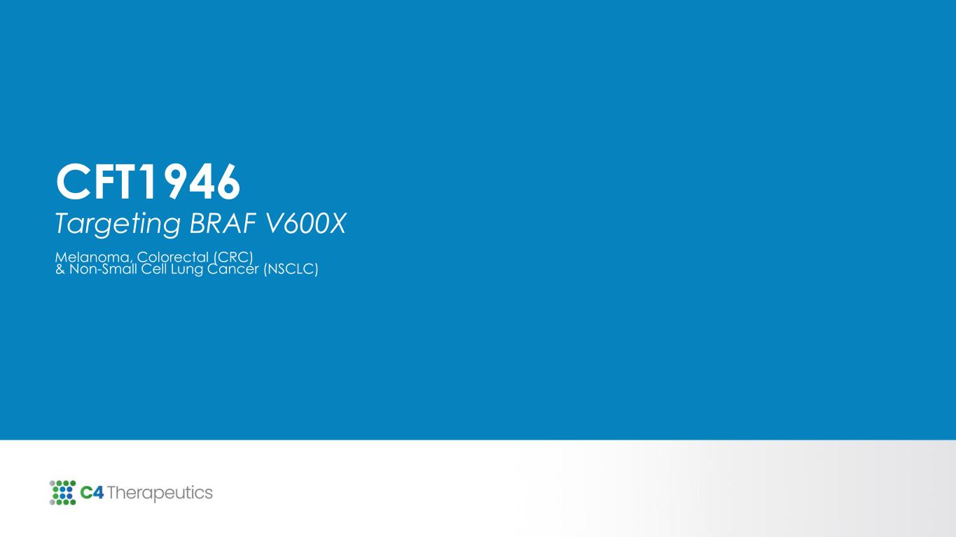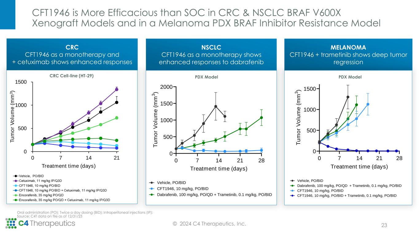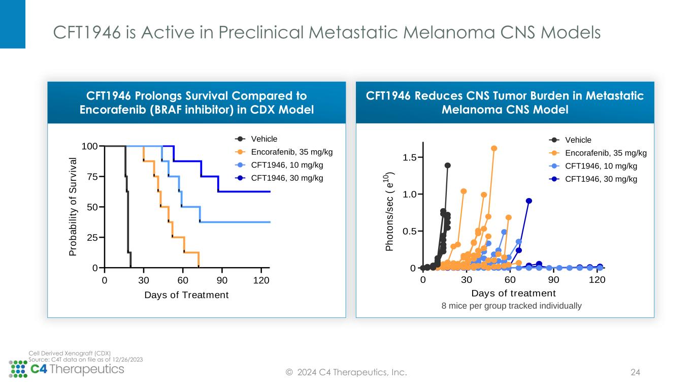 0 500 1000 1500 0 7 14 21 T u m o r V o lu m e ( m m 3 ) Treatment time (days) CFT1946 is More Efficacious than SOC in CRC & NSCLC BRAF V600X Xenograft Models and in a Melanoma PDX BRAF Inhibitor Resistance Model CRC CFT1946 as a monotherapy and + cetuximab shows enhanced responses Oral administration (PO); Twice a day dosing (BID); Intraperitoneal injections (IP); Source: C4T data on file as of 12/31/23 MELANOMA CFT1946 + trametinib shows deep tumor regression © 2024 C4 Therapeutics, Inc. CRC Cell-line (HT-29) 0 7 14 21 28 0 500 1000 1500 2000 Treatment time (days) T u m o r V o lu m e ( m m 3 ) Vehicle, PO/BID CFT1946, 10 mg/kg, PO/BID Dabrafenib, 100 mg/kg, PO/QD + Trametinib, 0.1 mg/kg, PO/BID 0 7 14 21 28 0 500 1000 1500 Treatment time (days) T u m o r V o lu m e ( m m 3 ) Vehicle, PO/BID CFT1946, 10 mg/kg, PO/BID CFT1946, 10 mg/kg, PO/BID + Trametinib, 0.1 mg/kg, PO/BID Dabrafenib, 100 mg/kg, PO/QD + Trametinib, 0.1 mg/kg, PO/BID 0 7 14 21 28 0 500 1000 1500 Treatment time (days) T u m o r V o lu m e ( m m 3 ) Vehicle, PO/BID CFT1946, 10 mg/kg, PO/BID CFT1946, 10 mg/kg, PO/BID + Trametinib, 0.1 mg/kg, PO/BID Dabrafenib, 100 mg/kg, PO/QD + Trametinib, 0.1 mg/kg, PO/BID NSCLC CFT1946 as a monotherapy shows enhanced responses to dabrafenib 0 7 14 21 28 0 500 1000 1500 2000 Treatment time (days) T u m o r V o lu m e ( m m 3 ) Vehicle, PO/BID CFT1946, 10 mg/kg, PO/BID Dabrafenib, 100 mg/kg, PO/QD + Trametinib, 0.1 mg/kg, PO/BID 23 PDX Model PDX Model