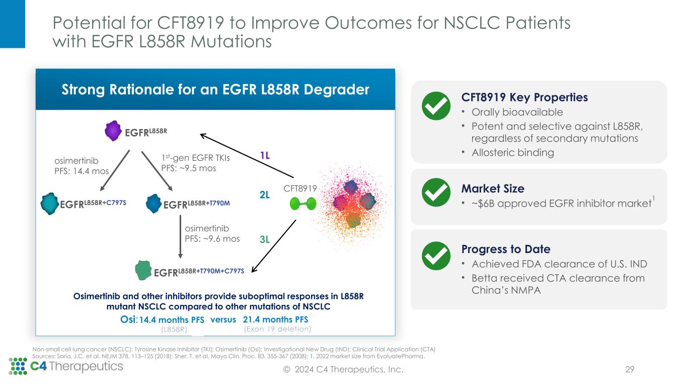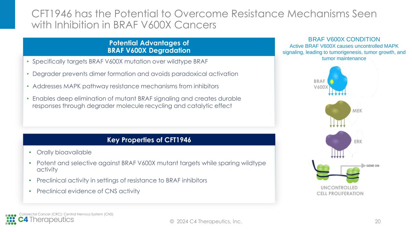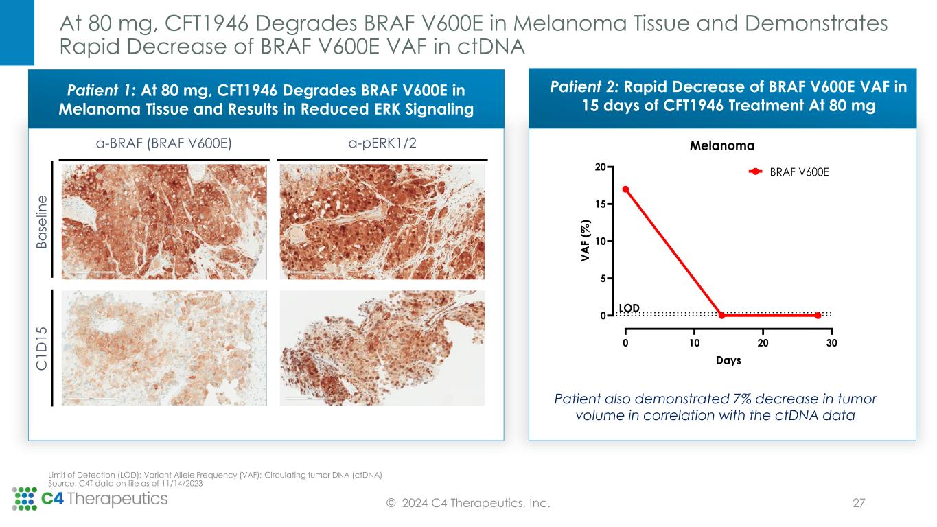 0 500 1000 1500 0 7 14 21 T u m o r V o lu m e ( m m 3 ) Treatment time (days) CFT1946 is More Efficacious than SOC in CRC & NSCLC BRAF V600X Xenograft Models and in a Melanoma PDX BRAF Inhibitor Resistance Model CRC CFT1946 as a monotherapy and + cetuximab shows enhanced responses Oral administration (PO); Twice a day dosing (BID); Intraperitoneal injections (IP); Source: C4T data on file as of 12/31/23 MELANOMA CFT1946 + trametinib shows deep tumor regression © 2024 C4 Therapeutics, Inc. CRC Cell-line (HT-29) 0 7 14 21 28 0 500 1000 1500 2000 Treatment time (days) T u m o r V o lu m e ( m m 3 ) Vehicle, PO/BID CFT1946, 10 mg/kg, PO/BID Dabrafenib, 100 mg/kg, PO/QD + Trametinib, 0.1 mg/kg, PO/BID 0 7 14 21 28 0 500 1000 1500 Treatment time (days) T u m o r V o lu m e ( m m 3 ) Vehicle, PO/BID CFT1946, 10 mg/kg, PO/BID CFT1946, 10 mg/kg, PO/BID + Trametinib, 0.1 mg/kg, PO/BID Dabrafenib, 100 mg/kg, PO/QD + Trametinib, 0.1 mg/kg, PO/BID 0 7 14 21 28 0 500 1000 1500 Treatment time (days) T u m o r V o lu m e ( m m 3 ) Vehicle, PO/BID CFT1946, 10 mg/kg, PO/BID CFT1946, 10 mg/kg, PO/BID + Trametinib, 0.1 mg/kg, PO/BID Dabrafenib, 100 mg/kg, PO/QD + Trametinib, 0.1 mg/kg, PO/BID NSCLC CFT1946 as a monotherapy shows enhanced responses to dabrafenib 0 7 14 21 28 0 500 1000 1500 2000 Treatment time (days) T u m o r V o lu m e ( m m 3 ) Vehicle, PO/BID CFT1946, 10 mg/kg, PO/BID Dabrafenib, 100 mg/kg, PO/QD + Trametinib, 0.1 mg/kg, PO/BID 23 PDX Model PDX Model