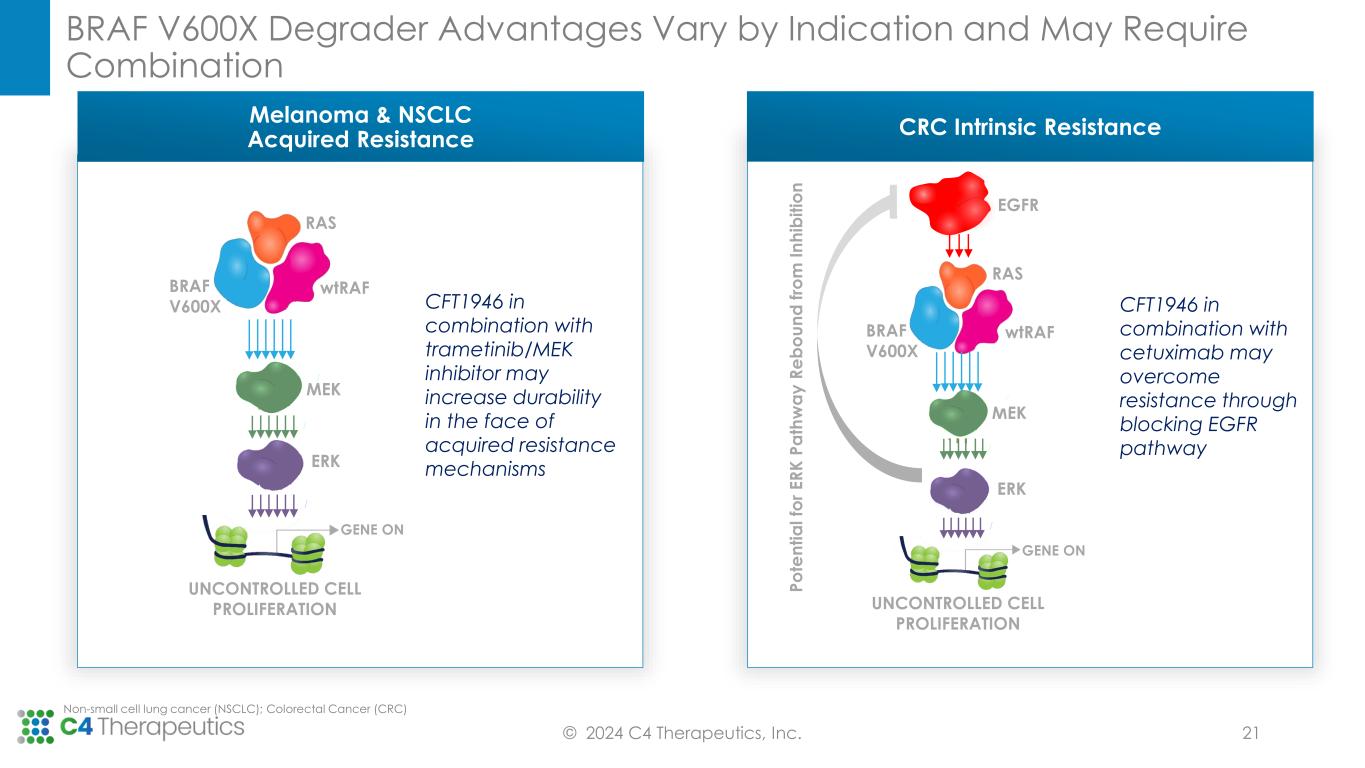 CFT1946 has the Potential to Overcome Resistance Mechanisms Seen with Inhibition in BRAF V600X Cancers © 2024 C4 Therapeutics, Inc. • Orally bioavailable • Potent and selective against BRAF V600X mutant targets while sparing wildtype activity • Preclinical activity in settings of resistance to BRAF inhibitors • Preclinical evidence of CNS activity • Specifically targets BRAF V600X mutation over wildtype BRAF • Degrader prevents dimer formation and avoids paradoxical activation • Addresses MAPK pathway resistance mechanisms from inhibitors • Enables deep elimination of mutant BRAF signaling and creates durable responses through degrader molecule recycling and catalytic effect Potential Advantages of BRAF V600X Degradation Key Properties of CFT1946 BRAF V600X CONDITION Active BRAF V600X causes uncontrolled MAPK signaling, leading to tumorigenesis, tumor growth, and tumor maintenance Colorectal Cancer (CRC); Central Nervous System (CNS) 20