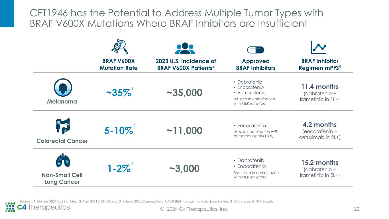 BRAF V600X Degrader Advantages Vary by Indication and May Require Combination © 2024 C4 Therapeutics, Inc. Non-small cell lung cancer (NSCLC); Colorectal Cancer (CRC) MEK ERK GENE ON UNCONTROLLED CELL PROLIFERATION wtRAF RAS BRAF V600X CFT1946 in combination with trametinib/MEK inhibitor may increase durability in the face of acquired resistance mechanisms CFT1946 in combination with cetuximab may overcome resistance through blocking EGFR pathway Melanoma & NSCLC Acquired Resistance CRC Intrinsic Resistance UNCONTROLLED CELL PROLIFERATION P o te n ti a l fo r E R K P a th w a y R e b o u n d f ro m I n h ib it io n MEK ERK EGFR GENE ON wtRAF RAS BRAF V600X 21