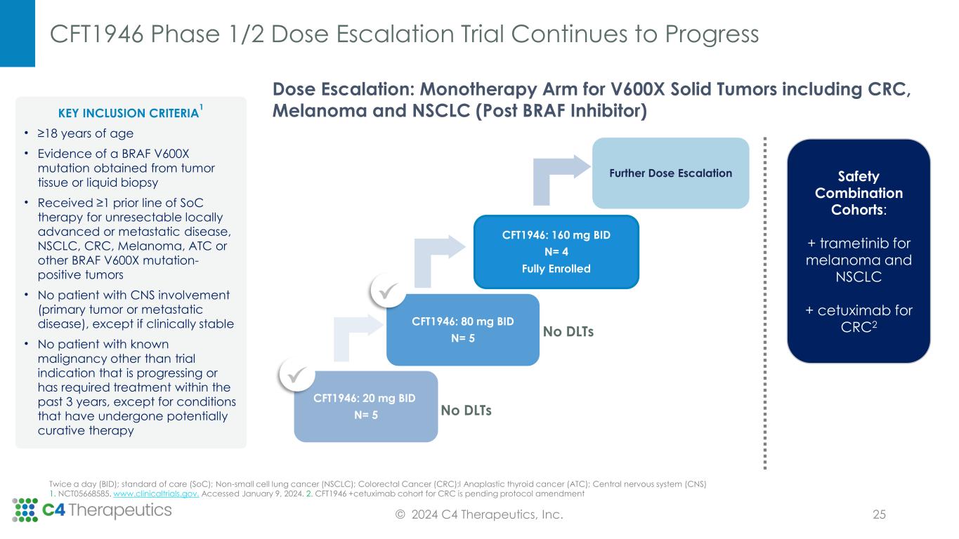 CFT1946 is Active in Preclinical Metastatic Melanoma CNS Models © 2024 C4 Therapeutics, Inc. 24 CFT1946 Reduces CNS Tumor Burden in Metastatic Melanoma CNS Model 0 30 60 90 120 0 Days of treatment P h o to n s /s e c ( e 1 0 ) Vehicle Encorafenib, 35 mg/kg CFT-1946, 10 mg/kg CFT-1946, 30 mg/kg 0.5 1.0 1.5 0 30 60 90 120 0 Days of treatment P h o to n s /s e c ( e 1 0 ) Vehicle Encorafenib, 35 mg/kg CFT1946, 10 mg/kg CFT1946, 30 mg/kg 0.5 1.0 1.5 8 mice per group tracked individually 0 30 60 90 120 0 25 50 75 100 BRAF Intracranial Model, Survival Days of Treatment P ro b a b il it y o f S u rv iv a l Vehicle CFT1946, 10 mg/kg CFT-1946, 30 mg/kg Encorafenib, 35 mg/kg 0 30 60 90 120 0 Days of treatment P h o to n s /s e c ( e 1 0 ) Vehicle Encorafenib, 35 mg/kg CFT1946, 10 mg/kg CFT1946, 30 mg/kg 0.5 1.0 1.5 CFT1946 Prolongs Survival Compared to Encorafenib (BRAF inhibitor) in CDX Model Cell Derived Xenograft (CDX) Source: C4T data on file as of 12/26/2023