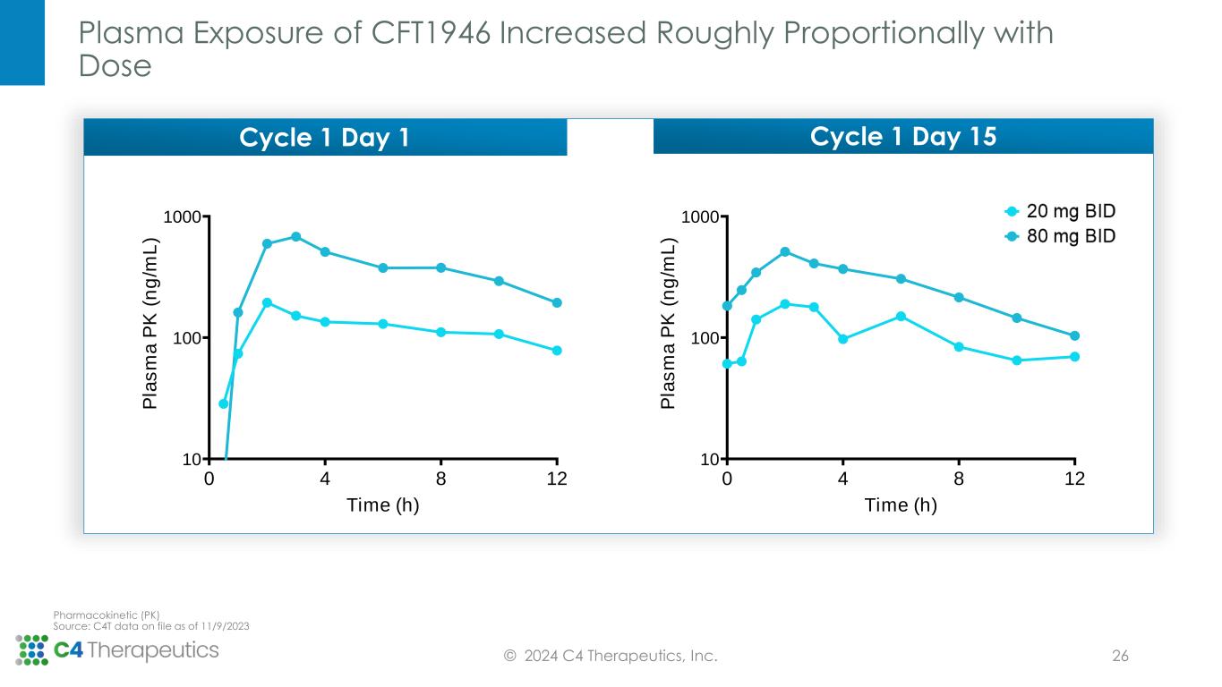 CFT1946 Phase 1/2 Dose Escalation Trial Continues to Progress Twice a day (BID); standard of care (SoC); Non-small cell lung cancer (NSCLC); Colorectal Cancer (CRC);l Anaplastic thyroid cancer (ATC); Central nervous system (CNS) 1. NCT05668585. www.clinicaltrials.gov. Accessed January 9, 2024. 2. CFT1946 +cetuximab cohort for CRC is pending protocol amendment © 2024 C4 Therapeutics, Inc. Dose Escalation: Monotherapy Arm for V600X Solid Tumors including CRC, Melanoma and NSCLC (Post BRAF Inhibitor) Further Dose Escalation CFT1946: 160 mg BID N= 4 Fully Enrolled CFT1946: 80 mg BID N= 5 CFT1946: 20 mg BID N= 5 Safety Combination Cohorts: + trametinib for melanoma and NSCLC + cetuximab for CRC2 KEY INCLUSION CRITERIA 1 • ≥18 years of age • Evidence of a BRAF V600X mutation obtained from tumor tissue or liquid biopsy • Received ≥1 prior line of SoC therapy for unresectable locally advanced or metastatic disease, NSCLC, CRC, Melanoma, ATC or other BRAF V600X mutation- positive tumors • No patient with CNS involvement (primary tumor or metastatic disease), except if clinically stable • No patient with known malignancy other than trial indication that is progressing or has required treatment within the past 3 years, except for conditions that have undergone potentially curative therapy No DLTs No DLTs 25