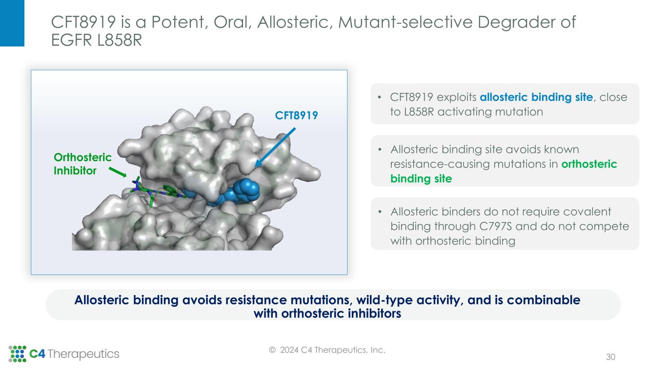 Potential for CFT8919 to Improve Outcomes for NSCLC Patients with EGFR L858R Mutations © 2024 C4 Therapeutics, Inc. 29 Market Size • ~$6B approved EGFR inhibitor market 1 Osimertinib and other inhibitors provide suboptimal responses in L858R mutant NSCLC compared to other mutations of NSCLC Strong Rationale for an EGFR L858R Degrader Non-small cell lung cancer (NSCLC); Tyrosine Kinase Inhibitor (TKI); Osimertinib (Osi); Investigational New Drug (IND); Clinical Trial Application (CTA) Sources: Soria, J.C. et al. NEJM 378, 113–125 (2018); Sher, T. et al, Mayo Clin. Proc. 83, 355-367 (2008); 1. 2022 market size from EvaluatePharma. EGFRL858R EGFRL858R+T790M EGFRL858R+T790M+C797S EGFRL858R+C797S osimertinib PFS: 14.4 mos 1st-gen EGFR TKIs PFS: ~9.5 mos osimertinib PFS: ~9.6 mos 2L 3L 1L CFT8919 CFT8919 Key Properties • Orally bioavailable • Potent and selective against L858R, regardless of secondary mutations • Allosteric binding Progress to Date • Achieved FDA clearance of U.S. IND • Betta received CTA clearance from China’s NMPA OSI 21.4 months PFS (Exon 19 deletion) 14.4 months PFS (L858R) Osi: versus