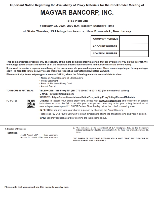 Important Notice Regarding the Availability of Proxy Materials for the Stockholder Meeting of MAGYAR BANCORP, INC. To Be Held On: February 22, 2024, 2:00 p.m. Eastern Standard Time at State Theatre, 15 Livingston Avenue, New Brunswick, New Jersey JOHN SMITH 1234 MAIN STREET APT. 203 NEW YORK, NY 10038 COMPANY NUMBER ACCOUNT NUMBER CONTROL NUMBER This communication presents only an overview of the more complete proxy materials that are available to you on the Internet. We encourage you to access and review all of the important information contained in the proxy materials before voting. If you want to receive a paper or e-mail copy of the proxy materials you must request one. There is no charge to you for requesting a copy. To facilitate timely delivery please make the request as instructed below before 2/8/2024. Please visit http://www.astproxyportal.com/ast/24418/, where the following materials are available for view: • Notice of Annual Meeting of Stockholders • Proxy Statement • Form of Electronic Proxy Card • Annual Report TO REQUEST MATERIAL: TELEPHONE: 888-Proxy-NA (888-776-9962) 718-921-8562 (for international callers) E-MAIL: info@astfinancial.com WEBSITE: https://us.astfinancial.com/OnlineProxyVoting/ProxyVoting/RequestMaterials TO VOTE: ONLINE: To access your online proxy card, please visit www.voteproxy.com and follow the on-screen instructions or scan the QR code with your smartphone. You may enter your voting instructions at www.voteproxy.com up until 11:59 PM Eastern Time the day before the cut-off or meeting date. IN PERSON: You may vote your shares in person by attending the Annual Meeting. Please call 732-342-7600 if you wish to obtain directions to attend the annual meeting and vote in person. MAIL: You may request a card by following the instructions above. 1. Election of Directors: NOMINEES: Jon R. Ansari, MBA three year term Andrew G. Hodulik, CPA three year term 2. The ratification of the appointment of S.R Snodgrass, P.C. as the Company’s independent registered public accounting firm for the fiscal year ending September 30, 2024. THE BOARD OF DIRECTORS RECOMMENDS A VOTE “FOR” THE ELECTION OF DIRECTORS AND “FOR” PROPOSAL 2. Please note that you cannot use this notice to vote by mail.