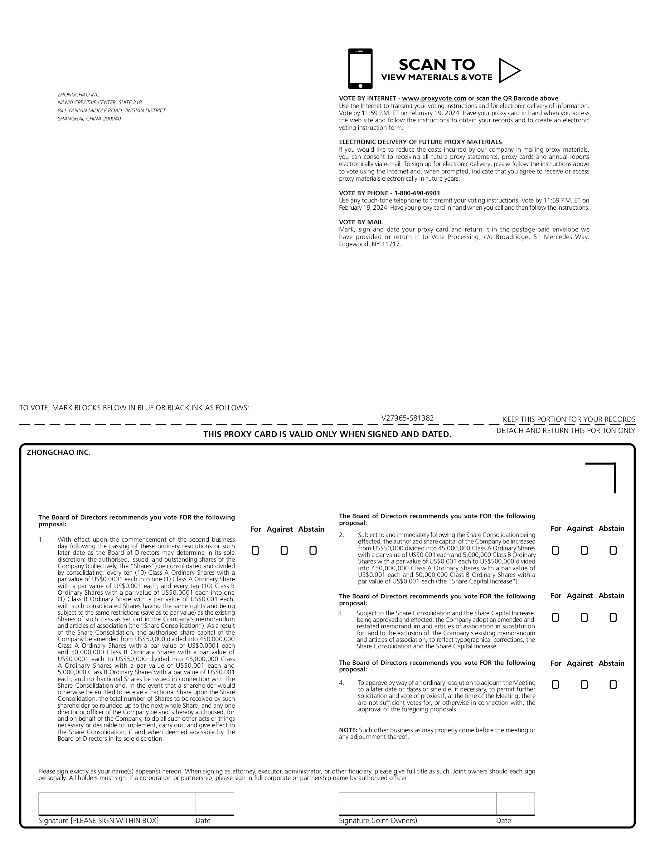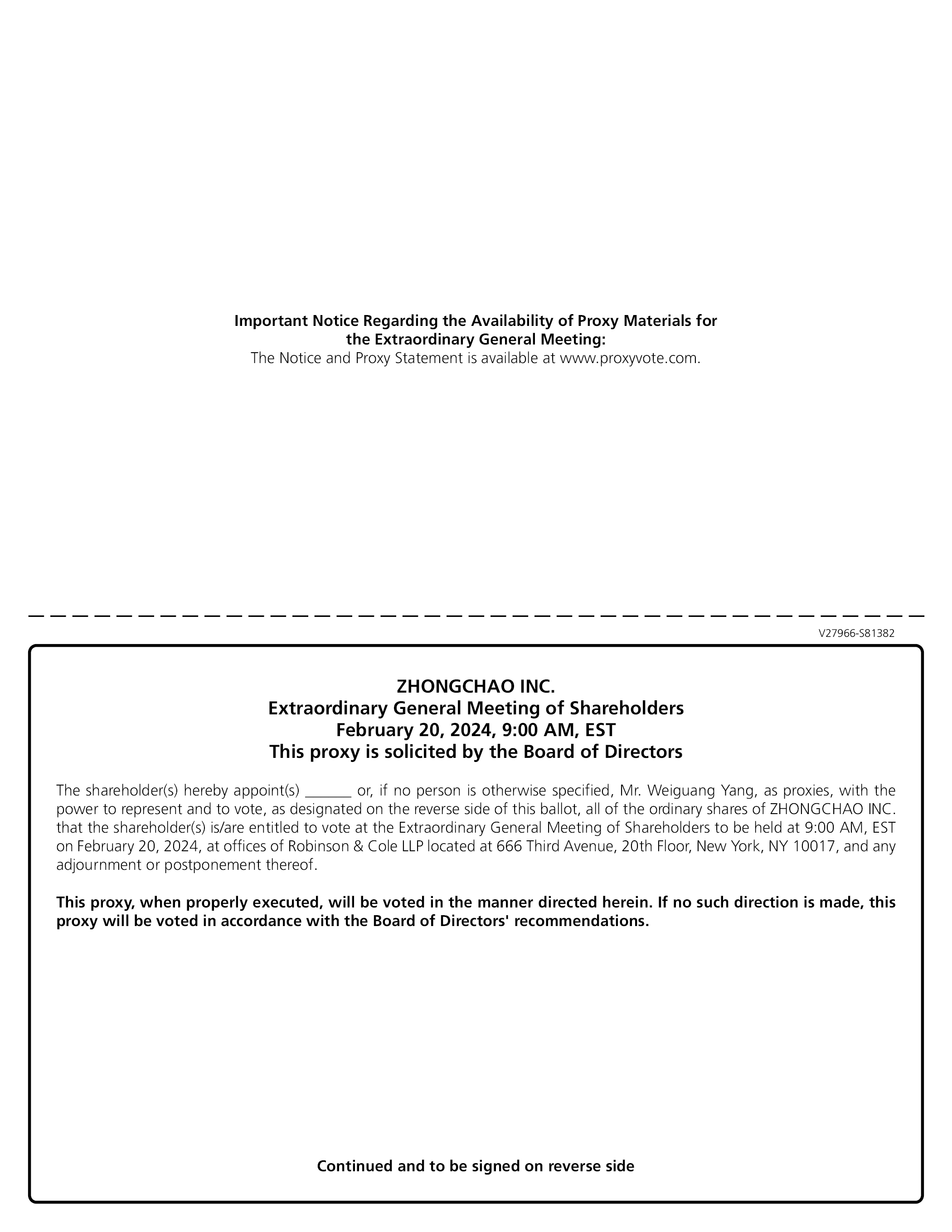 In connection with the extraordinary general meeting of shareholders of Zhongchao Inc., a Cayman Islands exempted company (the “Company”), the Company hereby furnishes the following documents: