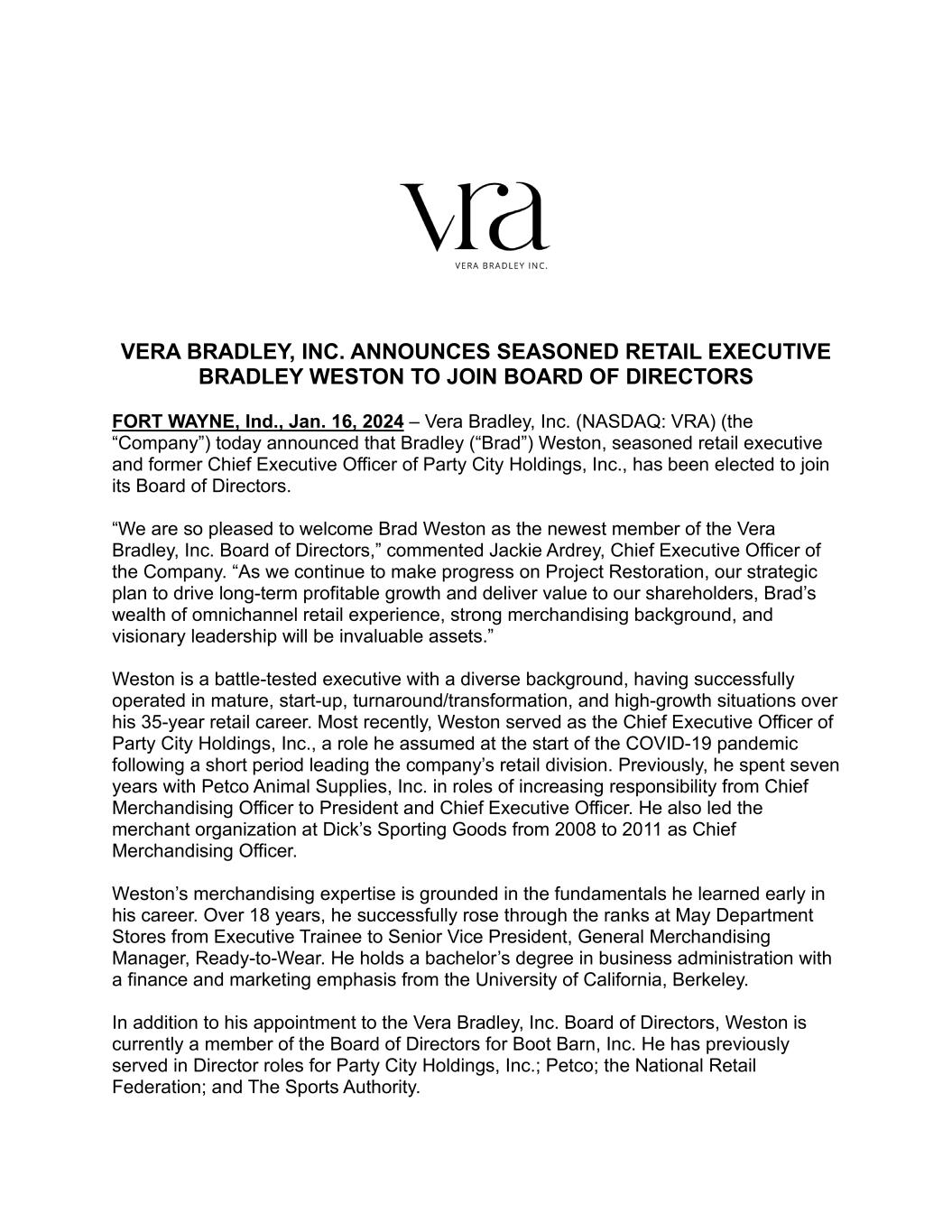 VERA BRADLEY, INC. ANNOUNCES SEASONED RETAIL EXECUTIVE BRADLEY WESTON TO JOIN BOARD OF DIRECTORS FORT WAYNE, Ind., Jan. 16, 2024 – Vera Bradley, Inc. (NASDAQ: VRA) (the “Company”) today announced that Bradley (“Brad”) Weston, seasoned retail executive and former Chief Executive Officer of Party City Holdings, Inc., has been elected to join its Board of Directors. “We are so pleased to welcome Brad Weston as the newest member of the Vera Bradley, Inc. Board of Directors,” commented Jackie Ardrey, Chief Executive Officer of the Company. “As we continue to make progress on Project Restoration, our strategic plan to drive long-term profitable growth and deliver value to our shareholders, Brad’s wealth of omnichannel retail experience, strong merchandising background, and visionary leadership will be invaluable assets.” Weston is a battle-tested executive with a diverse background, having successfully operated in mature, start-up, turnaround/transformation, and high-growth situations over his 35-year retail career. Most recently, Weston served as the Chief Executive Officer of Party City Holdings, Inc., a role he assumed at the start of the COVID-19 pandemic following a short period leading the company’s retail division. Previously, he spent seven years with Petco Animal Supplies, Inc. in roles of increasing responsibility from Chief Merchandising Officer to President and Chief Executive Officer. He also led the merchant organization at Dick’s Sporting Goods from 2008 to 2011 as Chief Merchandising Officer. Weston’s merchandising expertise is grounded in the fundamentals he learned early in his career. Over 18 years, he successfully rose through the ranks at May Department Stores from Executive Trainee to Senior Vice President, General Merchandising Manager, Ready-to-Wear. He holds a bachelor’s degree in business administration with a finance and marketing emphasis from the University of California, Berkeley. In addition to his appointment to the Vera Bradley, Inc. Board of Directors, Weston is currently a member of the Board of Directors for Boot Barn, Inc. He has previously served in Director roles for Party City Holdings, Inc.; Petco; the National Retail Federation; and The Sports Authority.