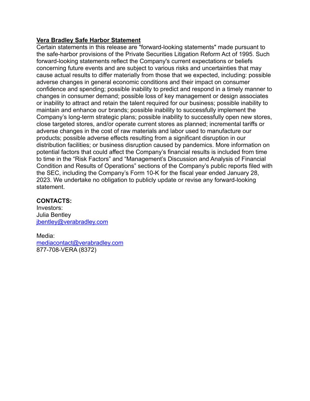 Vera Bradley Safe Harbor Statement Certain statements in this release are "forward-looking statements" made pursuant to the safe-harbor provisions of the Private Securities Litigation Reform Act of 1995. Such forward-looking statements reflect the Company's current expectations or beliefs concerning future events and are subject to various risks and uncertainties that may cause actual results to differ materially from those that we expected, including: possible adverse changes in general economic conditions and their impact on consumer confidence and spending; possible inability to predict and respond in a timely manner to changes in consumer demand; possible loss of key management or design associates or inability to attract and retain the talent required for our business; possible inability to maintain and enhance our brands; possible inability to successfully implement the Company’s long-term strategic plans; possible inability to successfully open new stores, close targeted stores, and/or operate current stores as planned; incremental tariffs or adverse changes in the cost of raw materials and labor used to manufacture our products; possible adverse effects resulting from a significant disruption in our distribution facilities; or business disruption caused by pandemics. More information on potential factors that could affect the Company’s financial results is included from time to time in the “Risk Factors” and “Management’s Discussion and Analysis of Financial Condition and Results of Operations” sections of the Company’s public reports filed with the SEC, including the Company’s Form 10-K for the fiscal year ended January 28, 2023. We undertake no obligation to publicly update or revise any forward-looking statement. CONTACTS: Investors: Julia Bentley jbentley@verabradley.com Media: mediacontact@verabradley.com 877-708-VERA (8372)