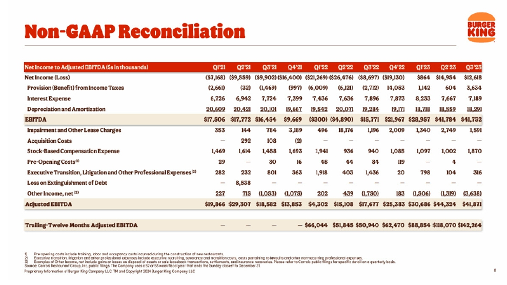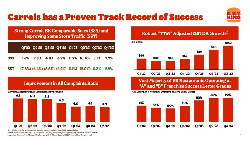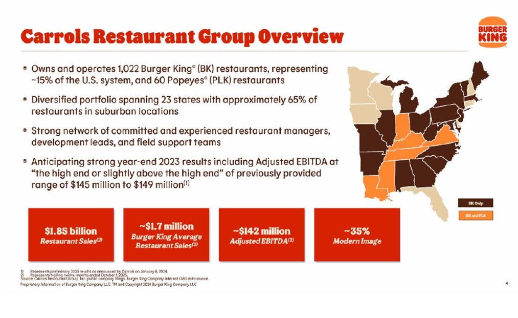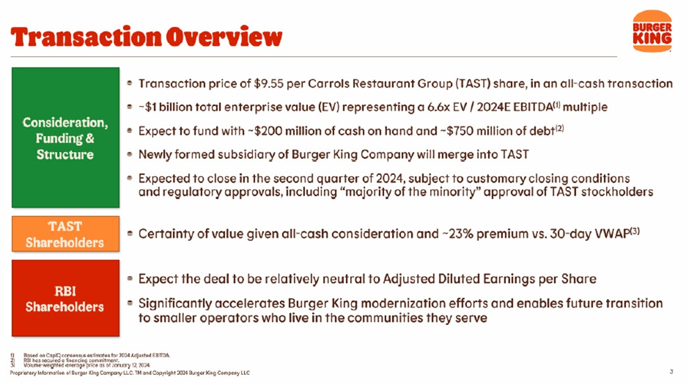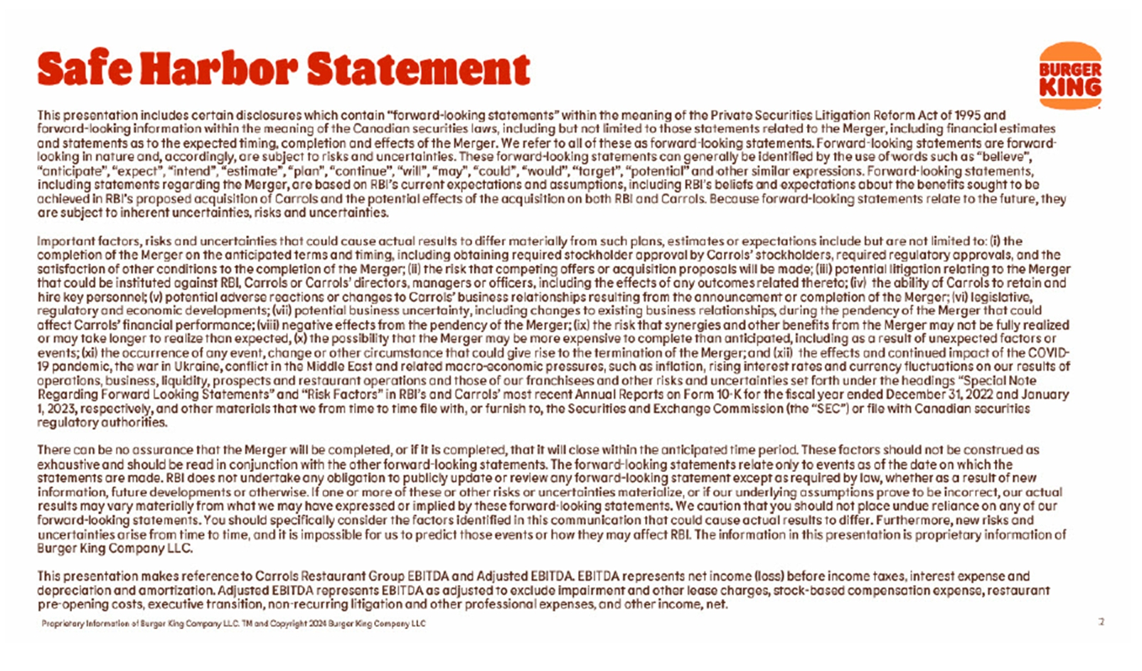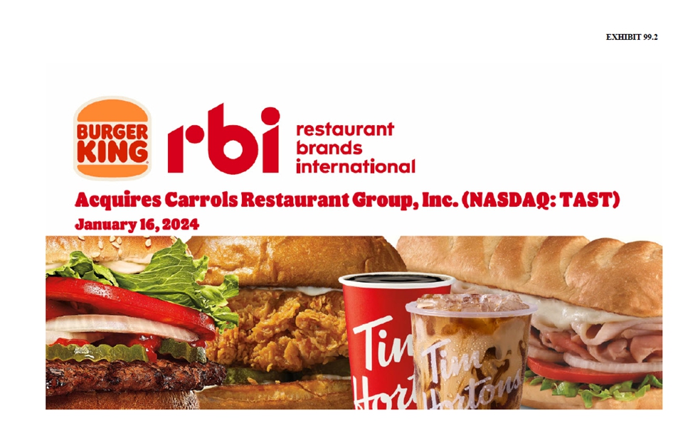 This presentation includes certain disclosures which contain “forward-looking statements” within the meaning of the Private Securities Litigation Reform Act of 1995, including but not limited to those statements related to that certain Agreement and Plan of Merger, dated of as January 16, 2024, by and among Carrols Restaurant Group, Inc., a Delaware corporation (“Carrols”), Restaurant Brands International Inc., a corporation existing under the laws of Canada (“RBI”), and BK Cheshire Corp, a Delaware corporation and subsidiary of RBI (“Merger Sub”), providing for the merger of Merger Sub with and into Carrols, with Carrols continuing as the surviving corporation (the “Merger”), including financial estimates and statements as to the expected timing, completion and effects of the Merger. We refer to all of these as forward-looking statements. Forward-looking statements are forward-looking in nature and, accordingly, are subject to risks and uncertainties. These forward-looking statements can generally be identified by the use of words such as “believe”, “anticipate”, “expect”, “intend”, “estimate”, “plan”, “continue”, “will”, “may”, “could”, “would”, “target”, “potential” and other similar expressions. Forward-looking statements, including statements regarding the Merger, are based on Carrols’ current expectations and assumptions, including Carrols’ beliefs and expectations about the value achieved in RBI’s proposed acquisition of Carrols. Because forward-looking statements relate to the future, they are subject to inherent uncertainties, risks and uncertainties.