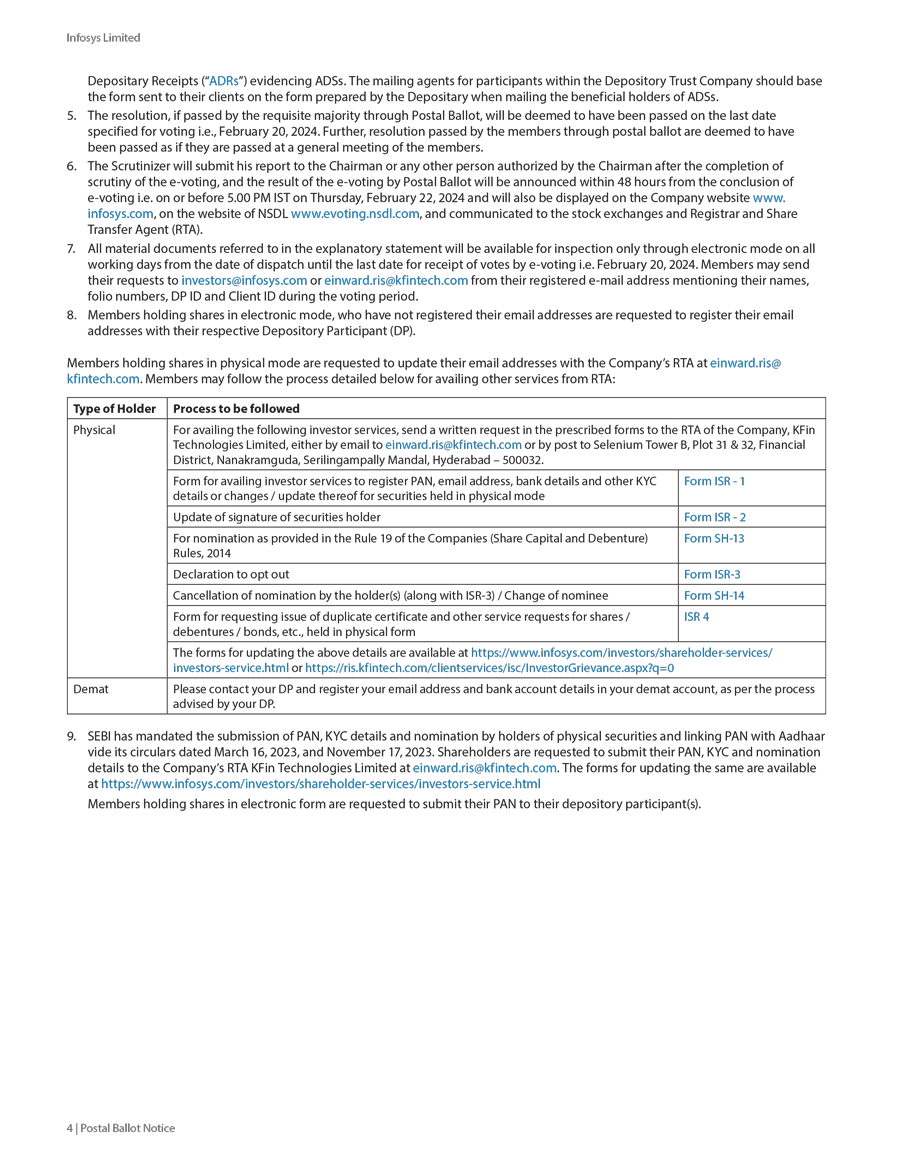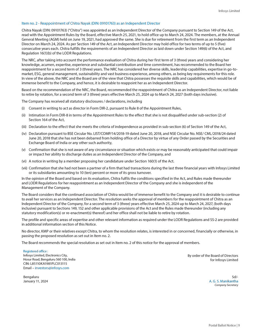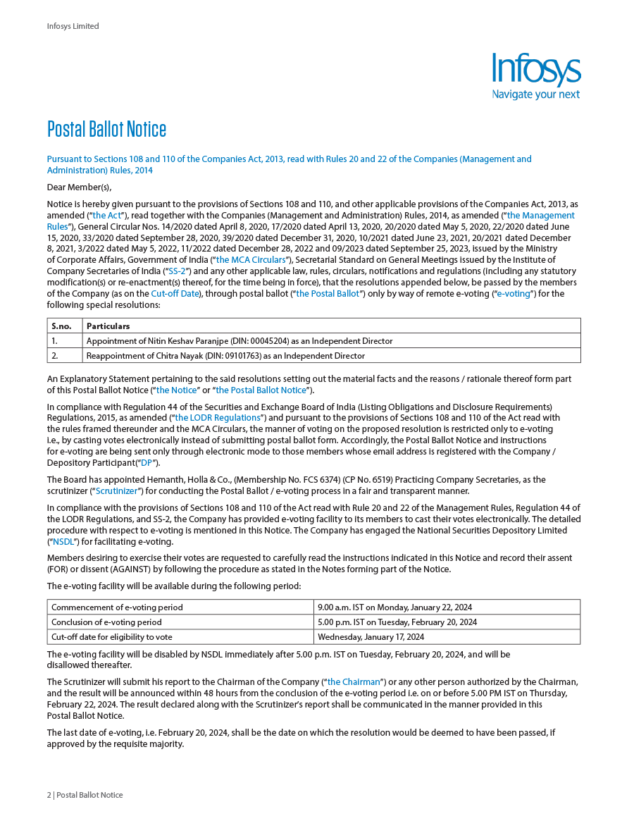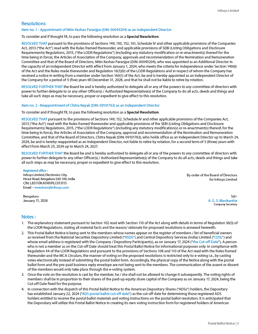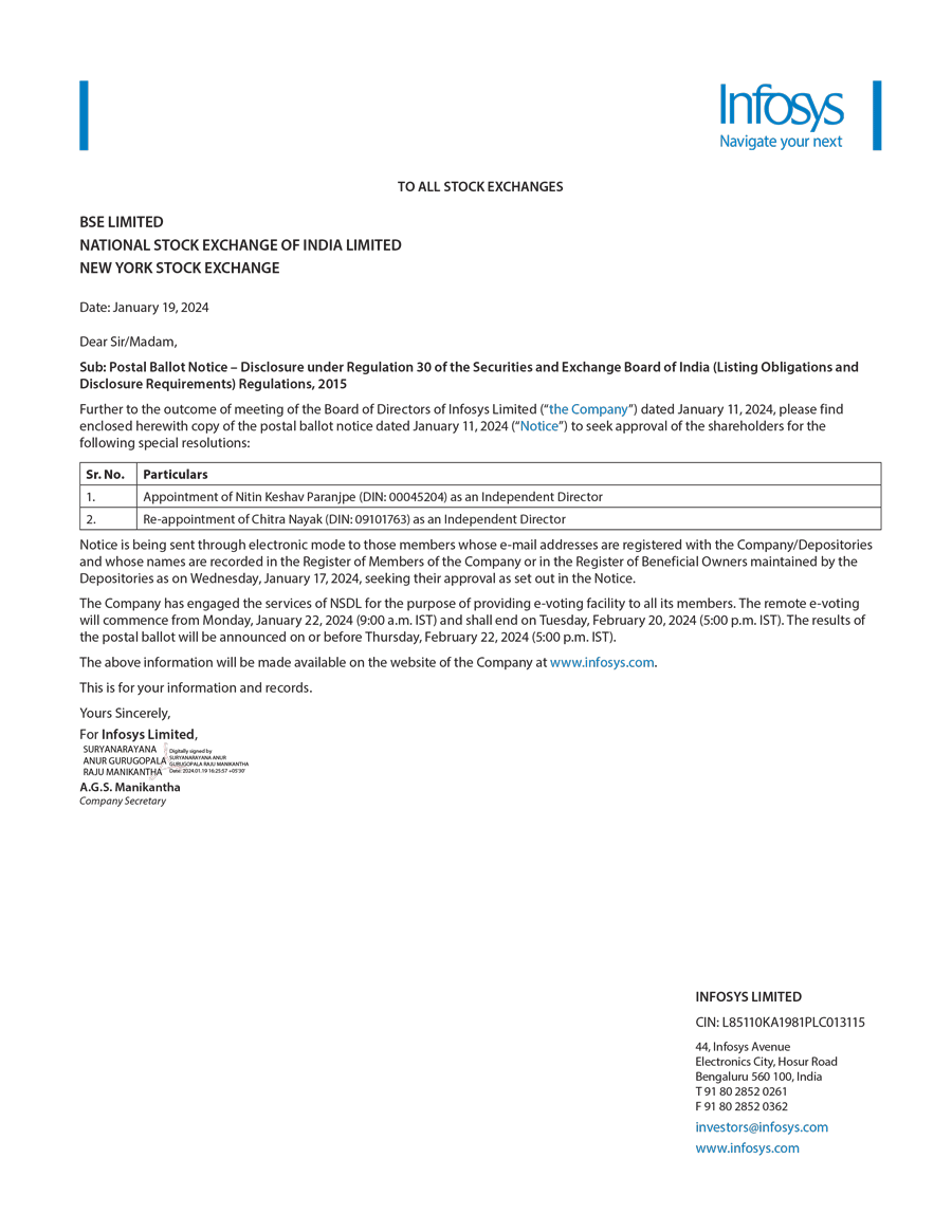Infosys Limited, a company organized under the laws of the Republic of India ("Infosys", or the "Company"), hereby furnishes with the United States Securities and Exchange Commission this Report on Form 6-K regarding the intimation dated January 19, 2024, pertaining to postal ballot notice to seek approval of the shareholders for the following resolutions;