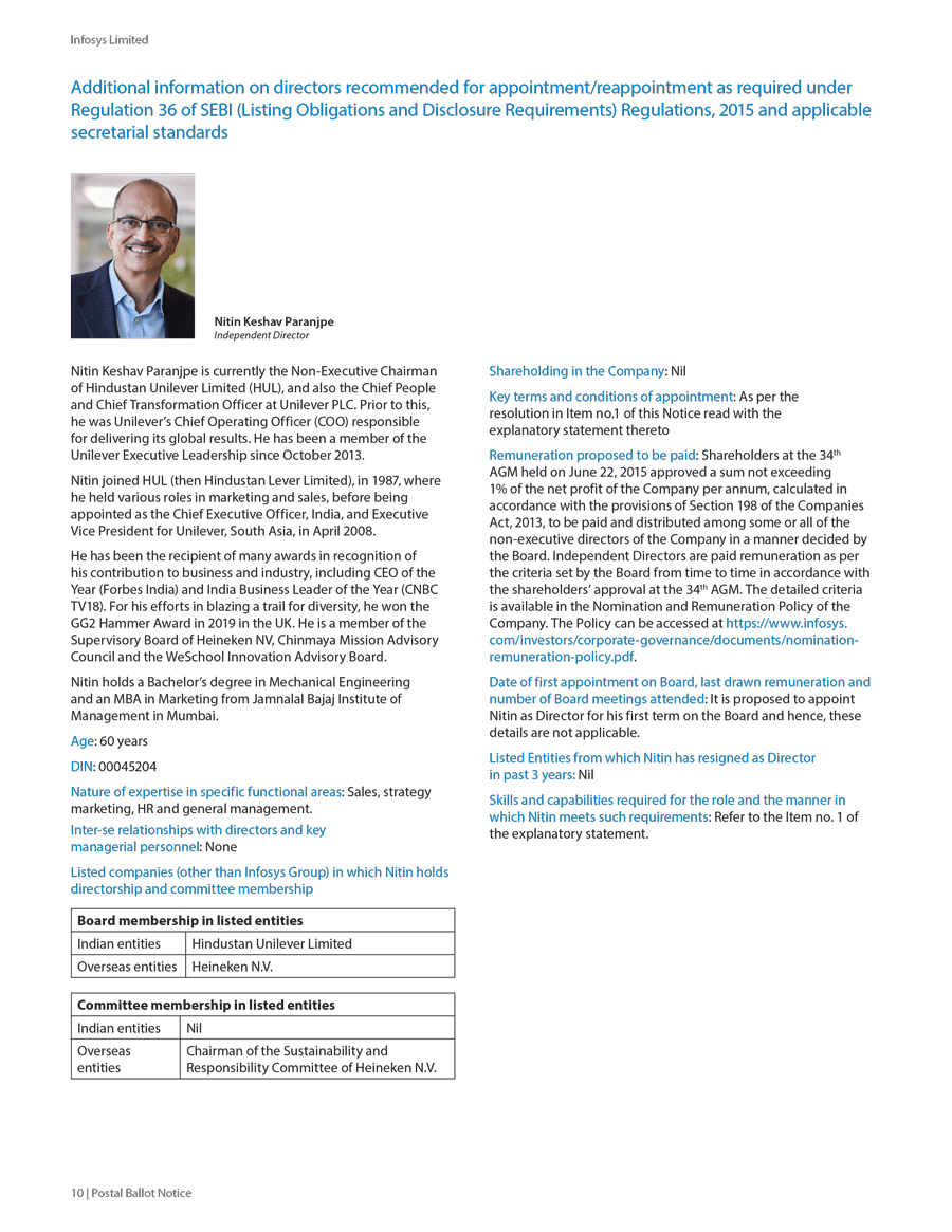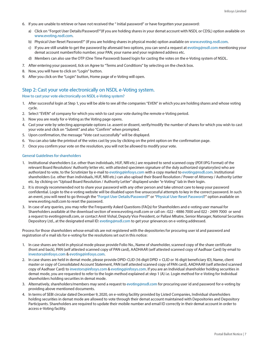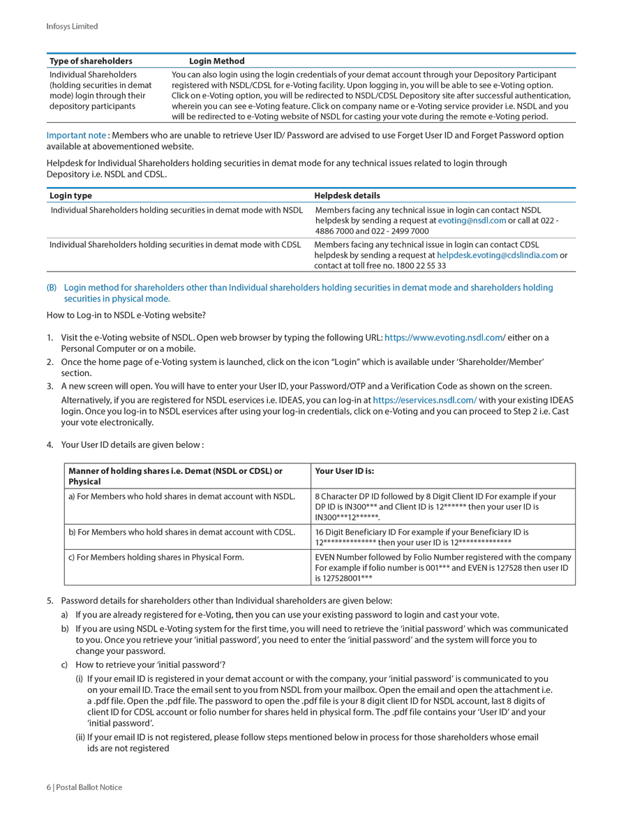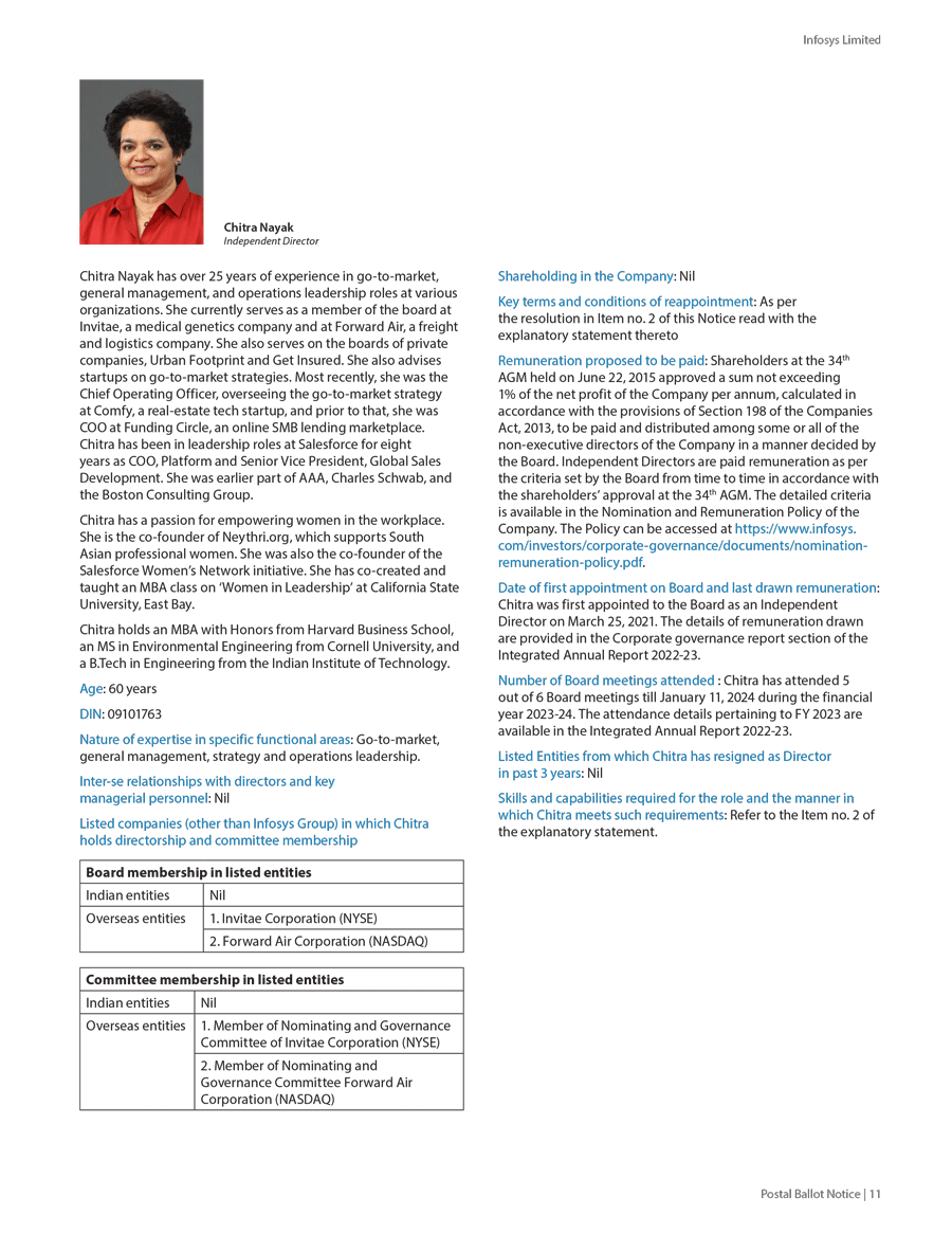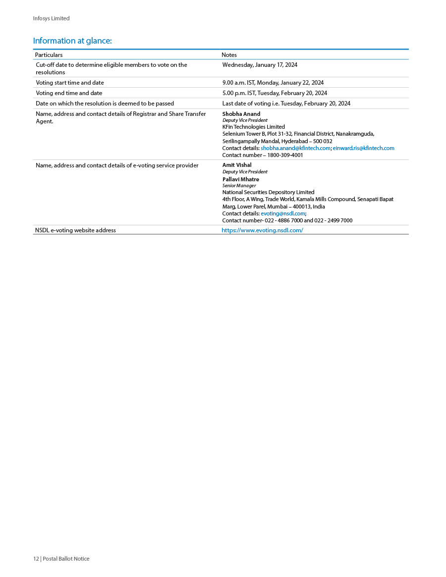 Infosys Limited, a company organized under the laws of the Republic of India ("Infosys", or the "Company"), hereby furnishes with the United States Securities and Exchange Commission this Report on Form 6-K regarding the intimation dated January 19, 2024, pertaining to postal ballot notice to seek approval of the shareholders for the following resolutions;
