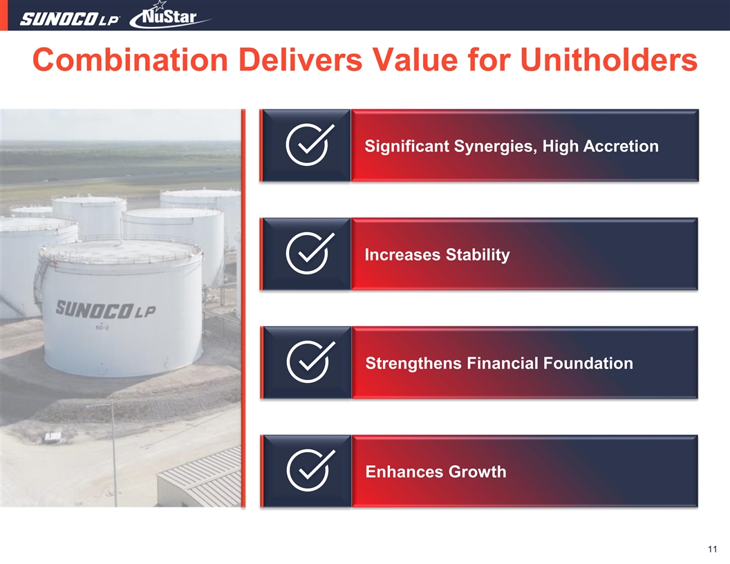 Expands Cash Flow At least $150 million of run-rate synergies • Expense – Scale generates opportunities for operational efficiencies and cost control strategies – Expense management and optimization are core competencies for SUN – Since 2018 SUN EBITDA has grown 51% while expenses have declined by 6% • Commercial – Vertical integration in refined products business provides opportunities to increase asset utilization while decreasing product cost – NS assets provide a platform for fuel distribution growth in expanded geography ~$50 million of additional cash flow from refinancing high-cost floating rate capital • Series A, B, and C Preferred Units • Subordinated Notes Higher Cash Flow Generation for Reinvestment and Distribution Growth 10