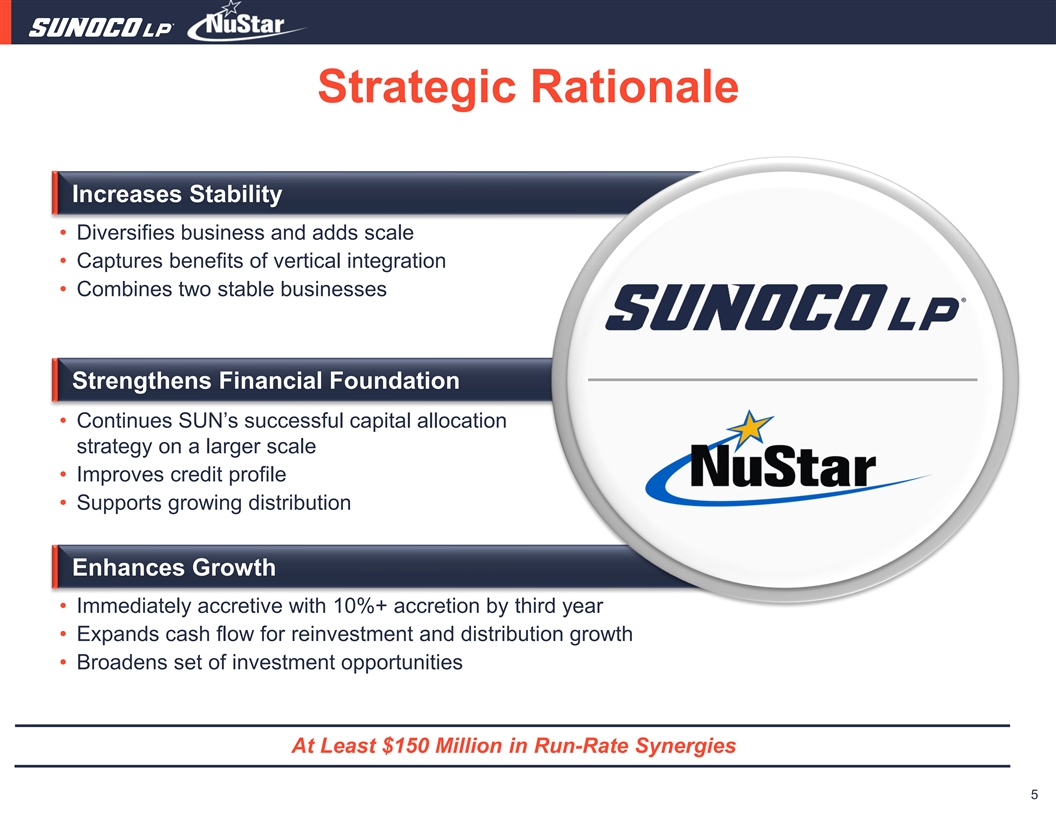 Transaction Overview 1 100% Equity/Unit-for-Unit Exchange Value to SUN and NS Unitholders • NS unitholders to receive 0.400 SUN units • 10%+ accretion at run-rate synergies by for each NS unit third year • Represents a 24% premium based on the • Strengthens balance sheet respective 30-day VWAP of SUN and NS • Participation in future upside and on 1/19/24 distribution growth • Attractive upfront premium for NS unitholders with tax deferral $7.3 Billion Transaction Value Process and Close • $3.1 billion of SUN equity issued to NS • Expect to close in Q2 2024 unitholders • Closing conditions include approval by • $2.6 billion of existing NS Senior Notes and NuStar’s unitholders and customary GoZone Bonds will remain outstanding regulatory approvals • $1.6 billion of NS Preferred Equity, Subordinated Notes, and outstanding revolver borrowings will be refinanced 1 Prior to closing, NS unitholders will receive a special one-time cash distribution in the amount of $0.212 per common unit. 4