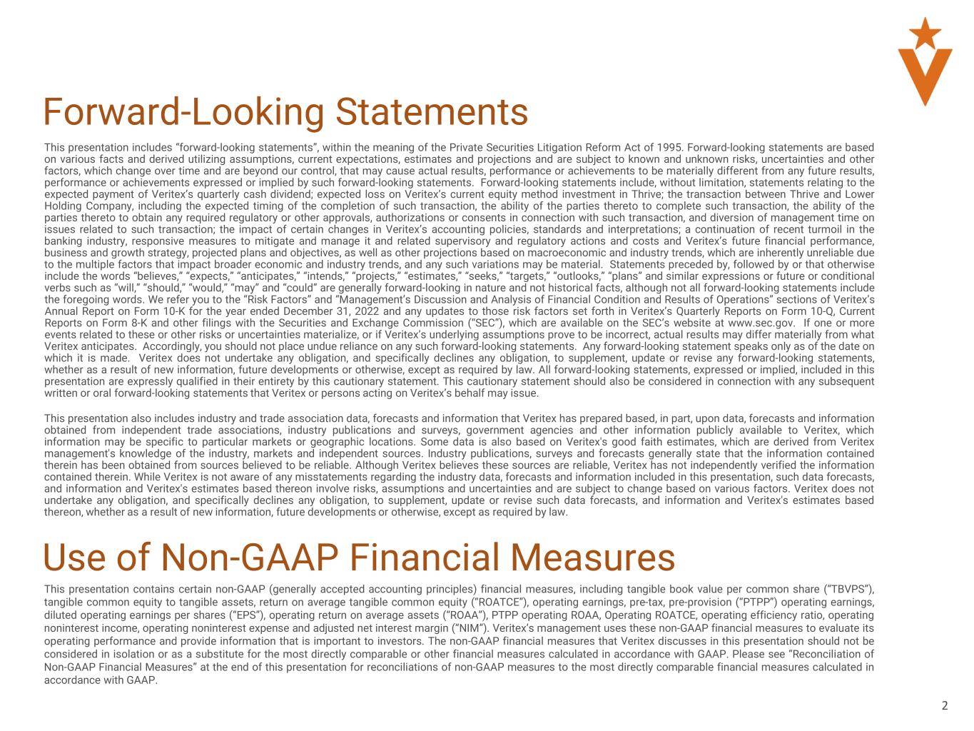This earnings release includes “forward-looking statements”, within the meaning of the Private Securities Litigation Reform Act of 1995. Forward-looking statements are based on various facts and derived utilizing assumptions, current expectations, estimates and projections and are subject to known and unknown risks, uncertainties and other factors, which change over time and are beyond our control, that may cause actual results, performance or achievements to be materially different from any future results, performance or achievements expressed or implied by such forward-looking statements. Forward-looking statements include, without limitation, statements relating to the expected payment of Veritex’s quarterly cash dividend; expected loss on Veritex’s current equity method investment in Thrive; the transaction between Thrive and Lower Holding Company, including the expected timing of the completion of such transaction, the ability of the parties thereto to complete such transaction, the ability of the parties thereto to obtain any required regulatory or other approvals, authorizations or consents in connection with such transaction, and diversion of management time on issues related to such transaction; the impact of certain changes in Veritex’s accounting policies, standards and interpretations; a continuation of recent turmoil in the banking industry, responsive measures to mitigate and manage it and related supervisory and regulatory actions and costs and Veritex’s future financial performance, business and growth strategy, projected plans and objectives, as well as other projections based on macroeconomic and industry trends, which are inherently unreliable due to the multiple factors that impact broader economic and industry trends, and any such variations may be material. Statements preceded by, followed by or that otherwise include the words “believes,” “expects,” “anticipates,” “intends,” “projects,” “estimates,” “seeks,” “targets,” “outlooks,” “plans” and similar expressions or future or conditional verbs such as “will,” “should,” “would,” “may” and “could” are generally forward-looking in nature and not historical facts, although not all forward-looking statements include the foregoing words. We refer you to the “Risk Factors” and “Management’s Discussion and Analysis of Financial Condition and Results of Operations” sections of Veritex’s Annual Report on Form 10-K for the year ended December 31, 2022 and any updates to those risk factors set forth in Veritex’s Quarterly Reports on Form 10-Q, Current Reports on Form 8-K and other filings with the Securities and Exchange Commission (“SEC”), which are available on the SEC’s website at www.sec.gov. If one or more events related to these or other risks or uncertainties materialize, or if Veritex’s underlying assumptions prove to be incorrect, actual results may differ materially from what Veritex anticipates. Accordingly, you should not place undue reliance