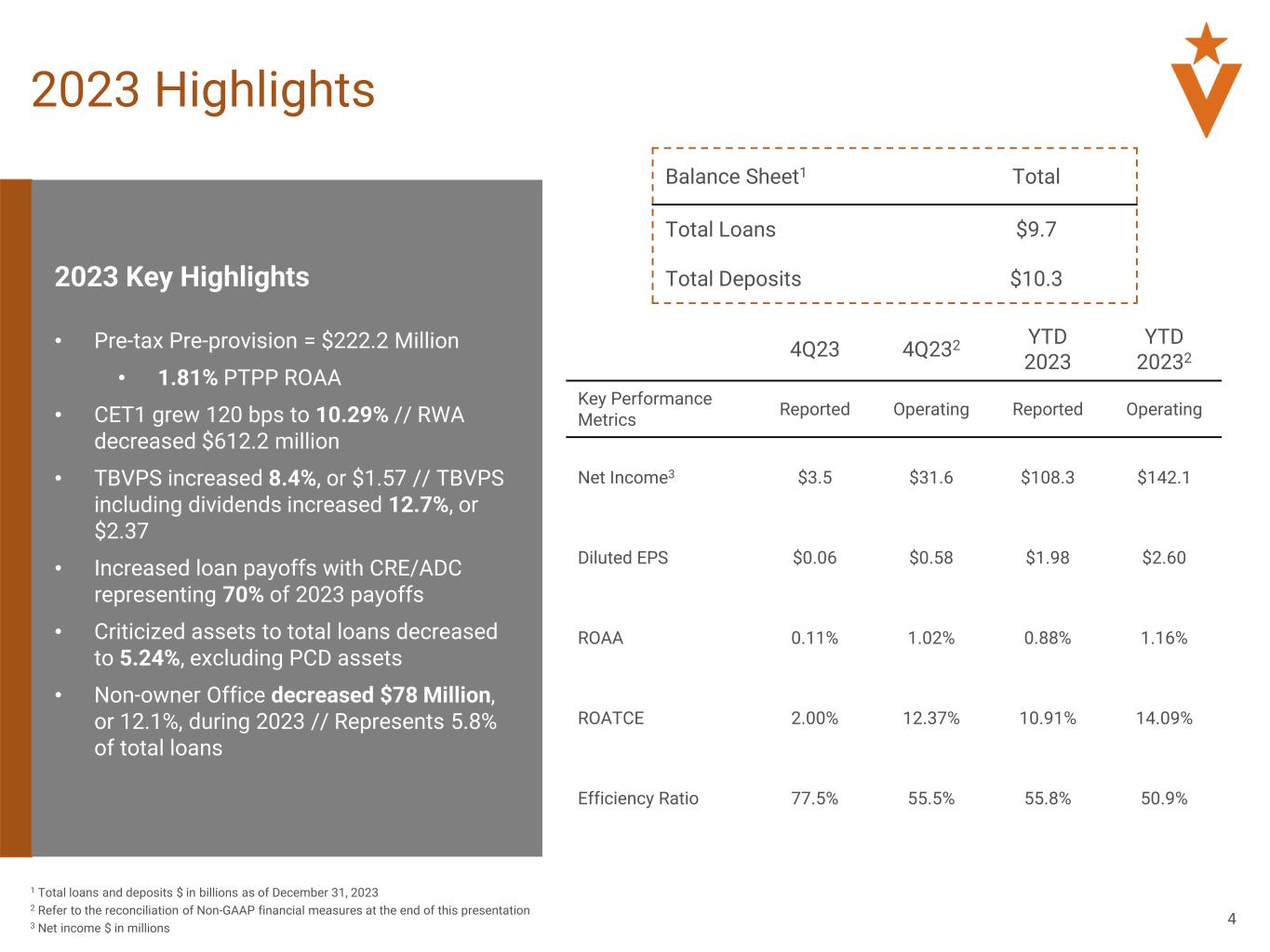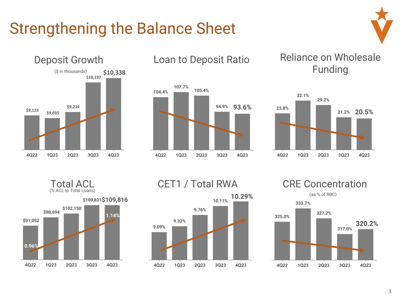 •Common equity tier 1 capital increased 120 bps to 10.29% as of December 31, 2023 compared to 9.09% as of December 31, 2022;