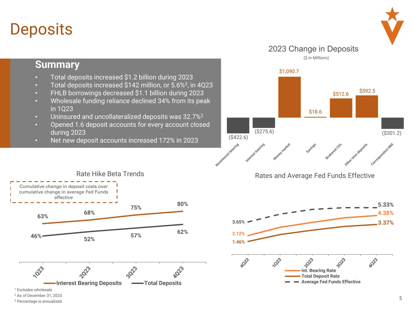 4 2023 Highlights Balance Sheet1 Total Total Loans $9.7 Total Deposits $10.3 1 Total loans and deposits $ in billions as of December 31, 2023 2 Refer to the reconciliation of Non-GAAP financial measures at the end of this presentation 3 Net income $ in millions 2023 Key Highlights • Pre-tax Pre-provision = $222.2 Million • 1.81% PTPP ROAA • CET1 grew 120 bps to 10.29% // RWA decreased $612.2 million • TBVPS increased 8.4%, or $1.57 // TBVPS including dividends increased 12.7%, or $2.37 • Increased loan payoffs with CRE/ADC representing 70% of 2023 payoffs • Criticized assets to total loans decreased to 5.24%, excluding PCD assets • Non-owner Office decreased $78 Million, or 12.1%, during 2023 // Represents 5.8% of total loans 4Q23 4Q232 YTD 2023 YTD 20232 Key Performance Metrics Reported Operating Reported Operating Net Income3 $3.5 $31.6 $108.3 $142.1 Diluted EPS $0.06 $0.58 $1.98 $2.60 ROAA 0.11% 1.02% 0.88% 1.16% ROATCE 2.00% 12.37% 10.91% 14.09% Efficiency Ratio 77.5% 55.5% 55.8% 50.9%