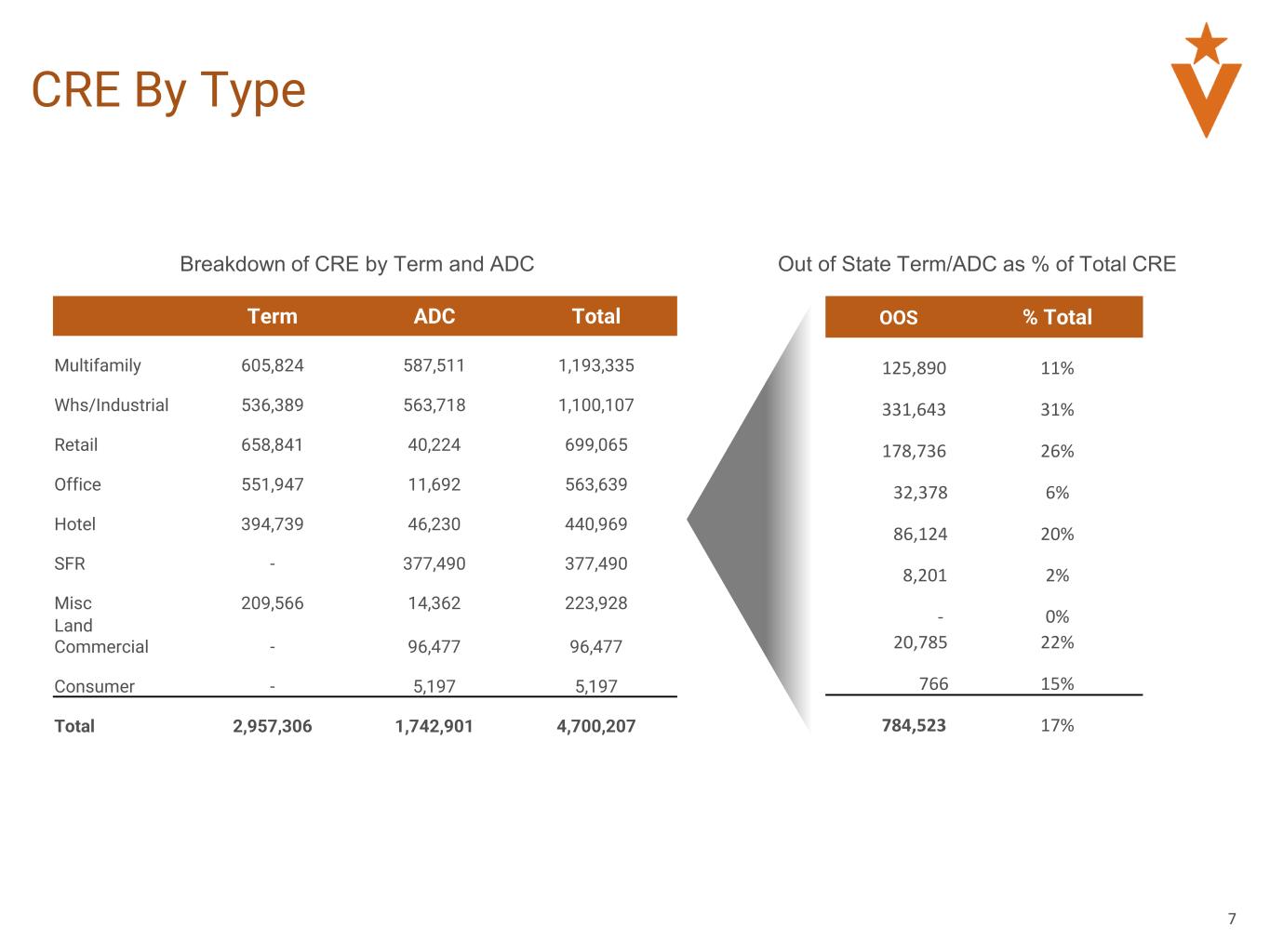 7 CRE By Type Term ADC Total Multifamily 605,824 587,511 1,193,335 Whs/Industrial 536,389 563,718 1,100,107 Retail 658,841 40,224 699,065 Office 551,947 11,692 563,639 Hotel 394,739 46,230 440,969 SFR - 377,490 377,490 Misc 209,566 14,362 223,928 Land Commercial - 96,477 96,477 Consumer - 5,197 5,197 Total 2,957,306 1,742,901 4,700,207 Breakdown of CRE by Term and ADC OOS % Total 125,890 11% 331,643 31% 178,736 26% 32,378 6% 86,124 20% 8,201 2% - 0% 20,785 22% 766 15% 784,523 17% Out of State Term/ADC as % of Total CRE