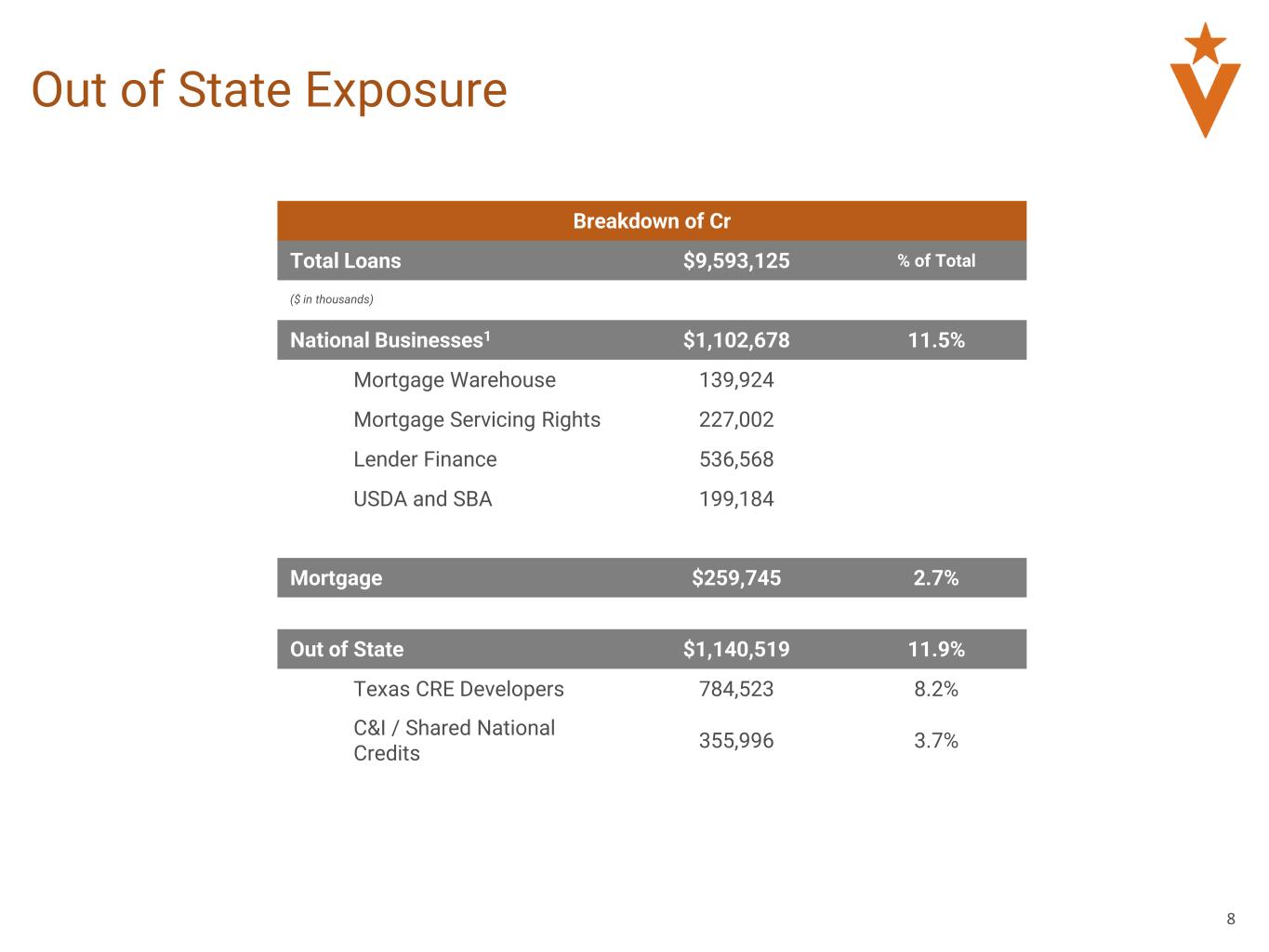 8 Out of State Exposure Breakdown of Cr Total Loans $9,593,125 % of Total National Businesses1 $1,102,678 11.5% Mortgage Warehouse 139,924 Mortgage Servicing Rights 227,002 Lender Finance 536,568 USDA and SBA 199,184 Mortgage $259,745 2.7% Out of State $1,140,519 11.9% Texas CRE Developers 784,523 8.2% C&I / Shared National Credits 355,996 3.7% ($ in thousands)