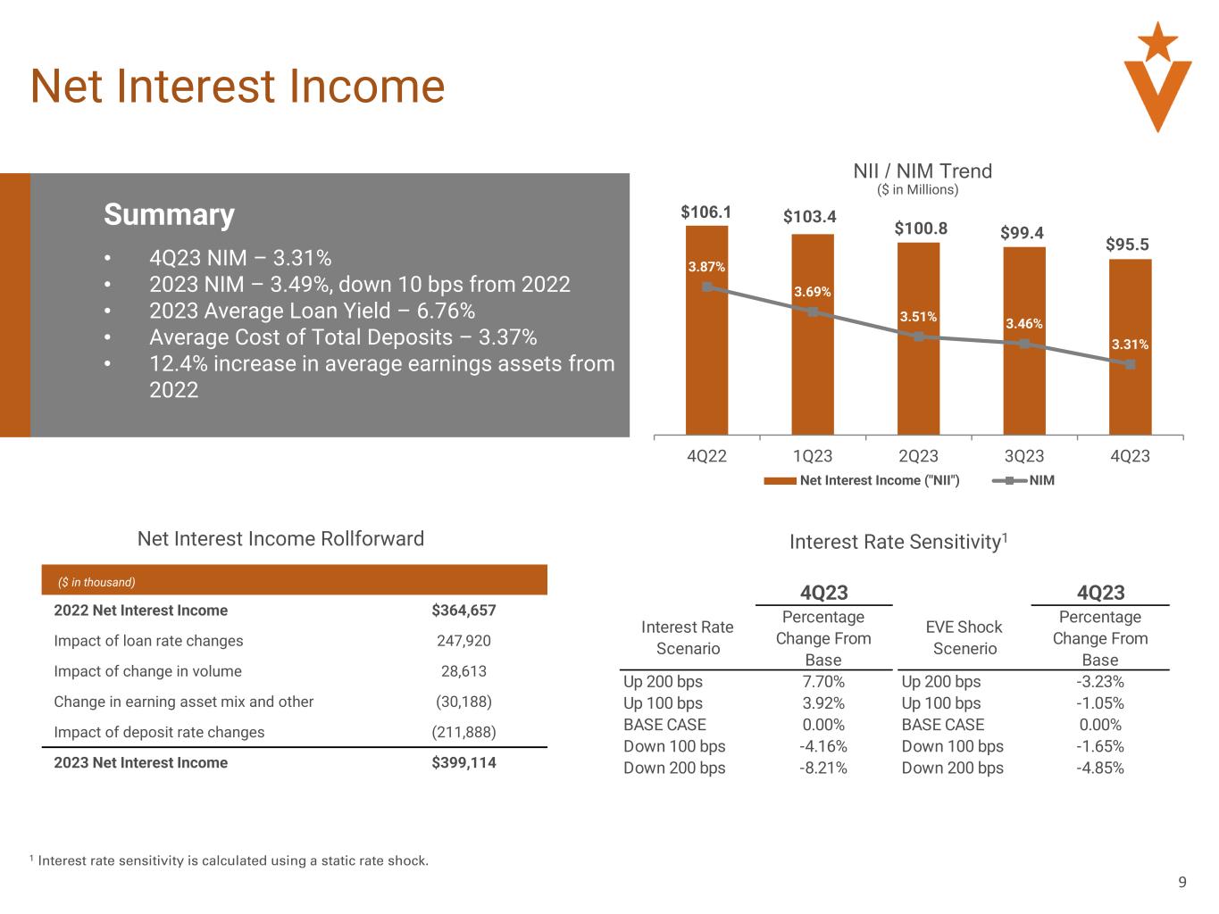 | Net interest income | | $ | 95,533 | | | $ | 99,361 | | | $ | 100,831 | | | $ | 103,389 | | | $ | 106,097 | | | $ | 399,114 | | | $ | 364,657 | |