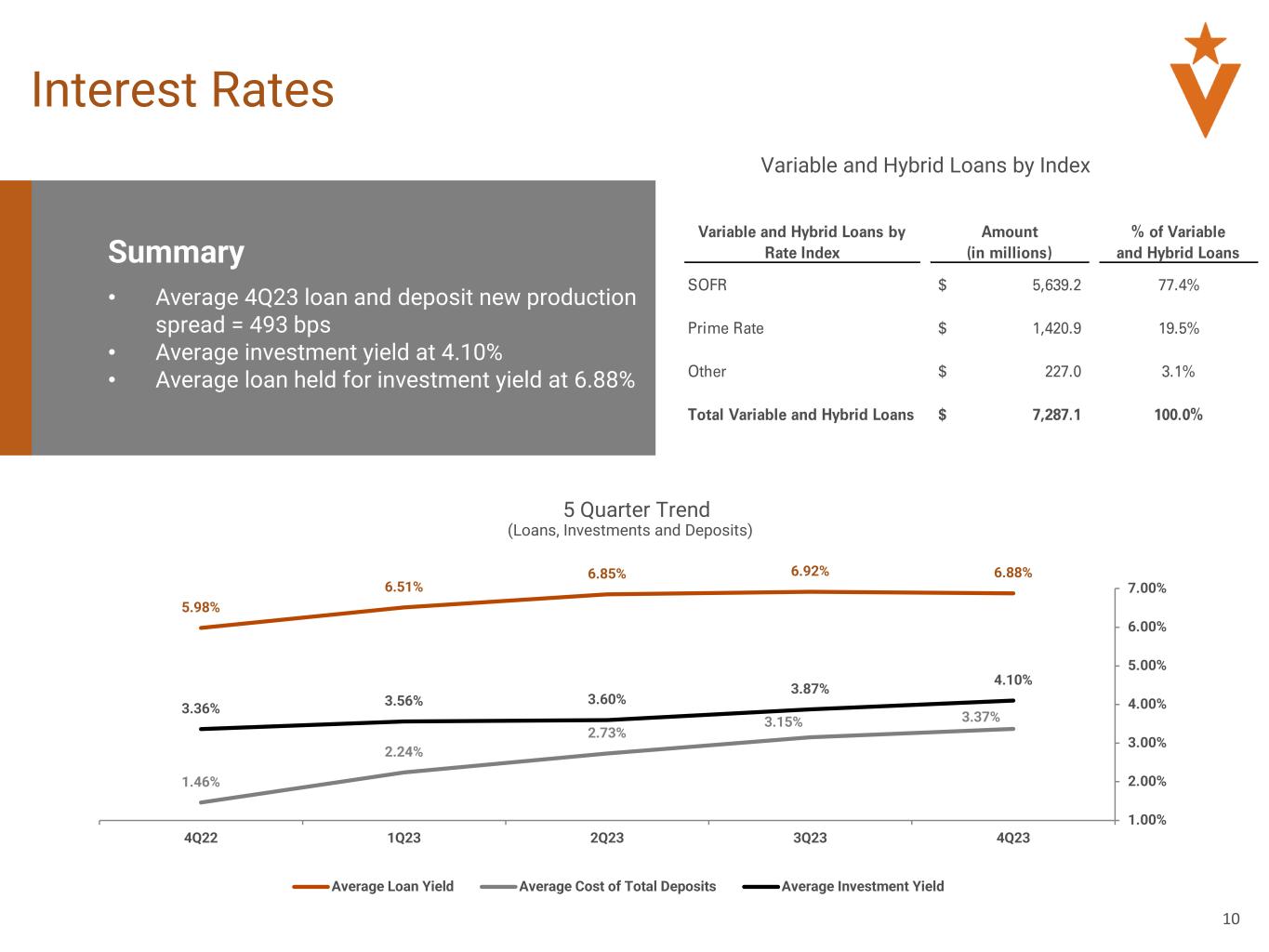 9 Net Interest Income Summary • 4Q23 NIM – 3.31% • 2023 NIM – 3.49%, down 10 bps from 2022 • 2023 Average Loan Yield – 6.76% • Average Cost of Total Deposits – 3.37% • 12.4% increase in average earnings assets from 2022 $103.4 $100.8 $99.4 $95.5 3.87% 3.69% 3.51% 3.46% 3.31% 4Q22 1Q23 2Q23 3Q23 4Q23 Net Interest Income ("NII") NIM $106.1 NII / NIM Trend 2022 Net Interest Income $364,657 Impact of loan rate changes 247,920 Impact of change in volume 28,613 Change in earning asset mix and other (30,188) Impact of deposit rate changes (211,888) 2023 Net Interest Income $399,114 ($ in thousand) Net Interest Income Rollforward Interest Rate Sensitivity1 1 Interest rate sensitivity is calculated using a static rate shock. ($ in Millions) 4Q23 4Q23 Interest Rate Scenario Percentage Change From Base EVE Shock Scenerio Percentage Change From Base Up 200 bps 7.70% Up 200 bps -3.23% Up 100 bps 3.92% Up 100 bps -1.05% BASE CASE 0.00% BASE CASE 0.00% Down 100 bps -4.16% Down 100 bps -1.65% Down 200 bps -8.21% Down 200 bps -4.85%