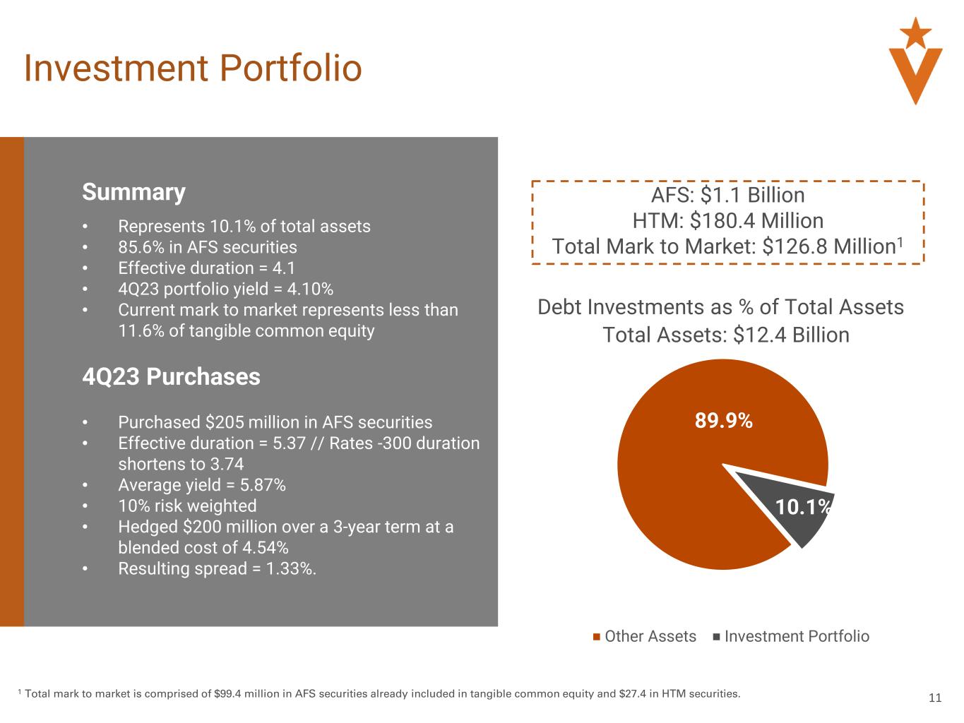 10 Interest Rates Summary • Average 4Q23 loan and deposit new production spread = 493 bps • Average investment yield at 4.10% • Average loan held for investment yield at 6.88% Variable and Hybrid Loans by Index 5.98% 6.51% 6.85% 6.92% 6.88% 1.46% 2.24% 2.73% 3.15% 3.37%3.36% 3.56% 3.60% 3.87% 4.10% 4Q22 1Q23 2Q23 3Q23 4Q23 1.00% 2.00% 3.00% 4.00% 5.00% 6.00% 7.00% Average Loan Yield Average Cost of Total Deposits Average Investment Yield 5 Quarter Trend (Loans, Investments and Deposits) Variable and Hybrid Loans by Rate Index Amount (in millions) % of Variable and Hybrid Loans SOFR 5,639.2$ 77.4% Prime Rate 1,420.9$ 19.5% Other 227.0$ 3.1% Total Variable and Hybrid Loans 7,287.1$ 100.0%