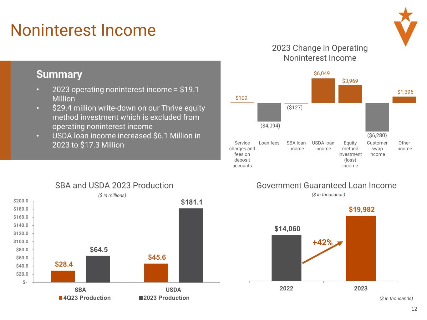Noninterest (loss) income for the three months ended December 31, 2023 was a loss of $17.8 million, a decrease of $27.5 million, or 283.9%, compared to noninterest income of $9.7 million for the three months ended September 30, 2023. The decrease in noninterest income was primarily due to a $29.3 million decrease in equity method investment income related to a write down of our equity method investment in Thrive Mortgage, LLC ("Thrive") related to Thrive’s entry into a definitive agreement in December 2023 to be acquired by Lower Holding Company. The decrease was partially offset by a $665 thousand increase in government guaranteed loan income, primarily driven by an increase in U.S. Department of Agriculture (“USDA”) loans sold through our wholly owned subsidiary North Avenue Capital, LLC ("NAC").