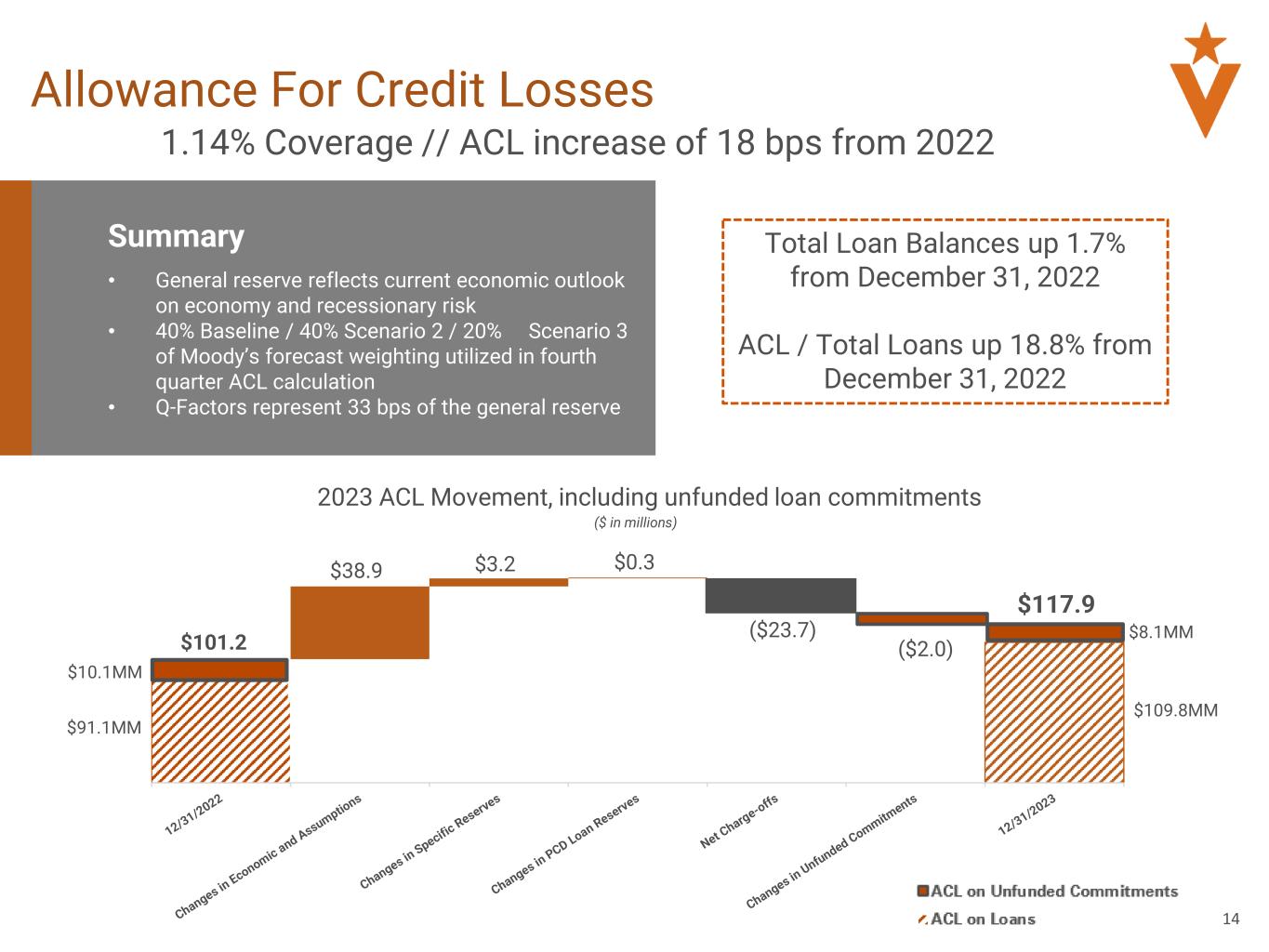 •Allowance for credit losses (“ACL”) to total loans increased to 1.14%, or 18 bps from 0.96% compared to December 31, 2022;