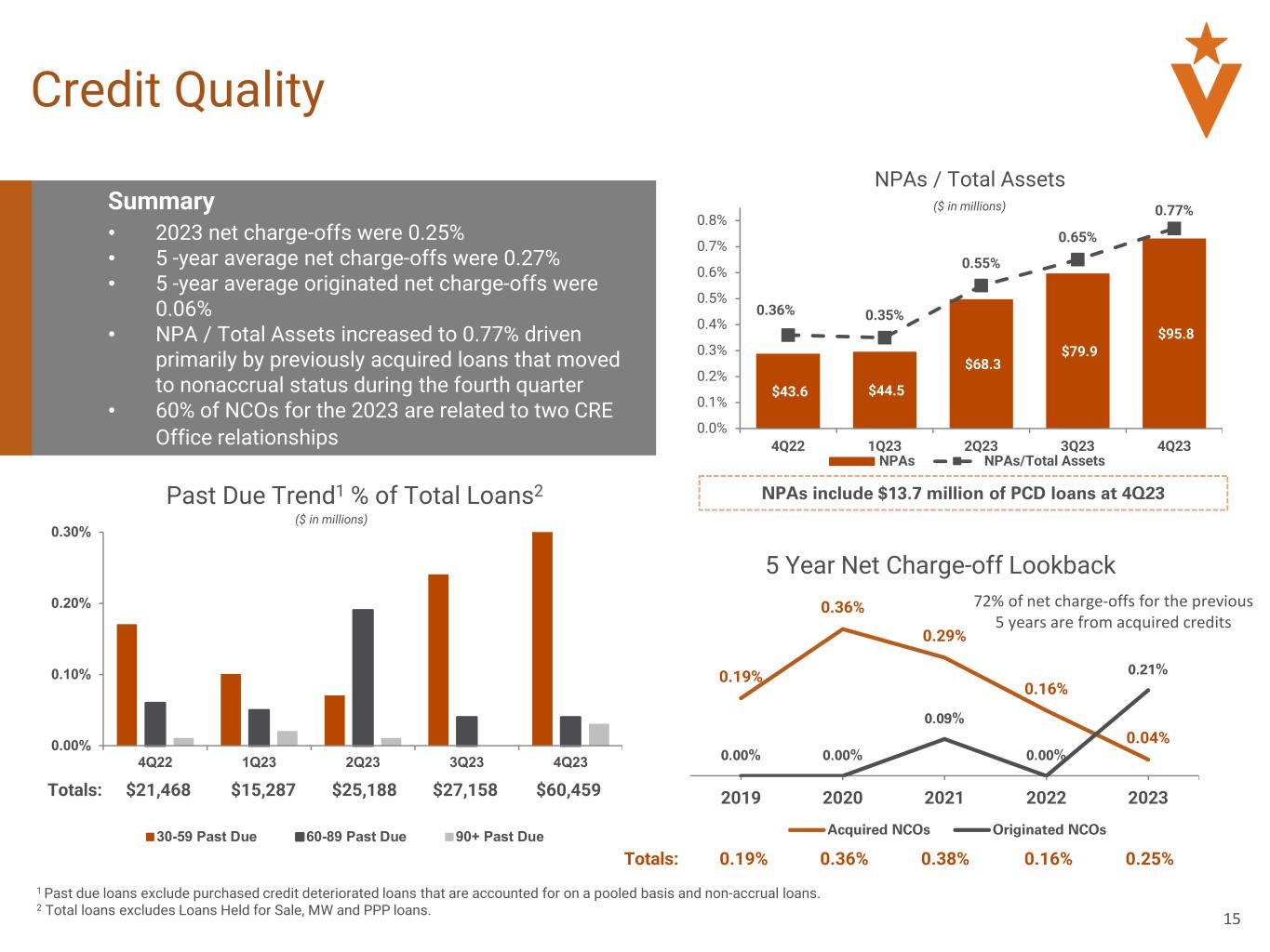 14 Allowance For Credit Losses Summary • General reserve reflects current economic outlook on economy and recessionary risk • 40% Baseline / 40% Scenario 2 / 20% Scenario 3 of Moody’s forecast weighting utilized in fourth quarter ACL calculation • Q-Factors represent 33 bps of the general reserve 1.14% Coverage // ACL increase of 18 bps from 2022 $3.2 $0.3 ($23.7) ($2.0)$101.2 $117.9 2023 ACL Movement, including unfunded loan commitments Total Loan Balances up 1.7% from December 31, 2022 ACL / Total Loans up 18.8% from December 31, 2022 $8.1MM $10.1MM $109.8MM $91.1MM ($ in millions) $38.9