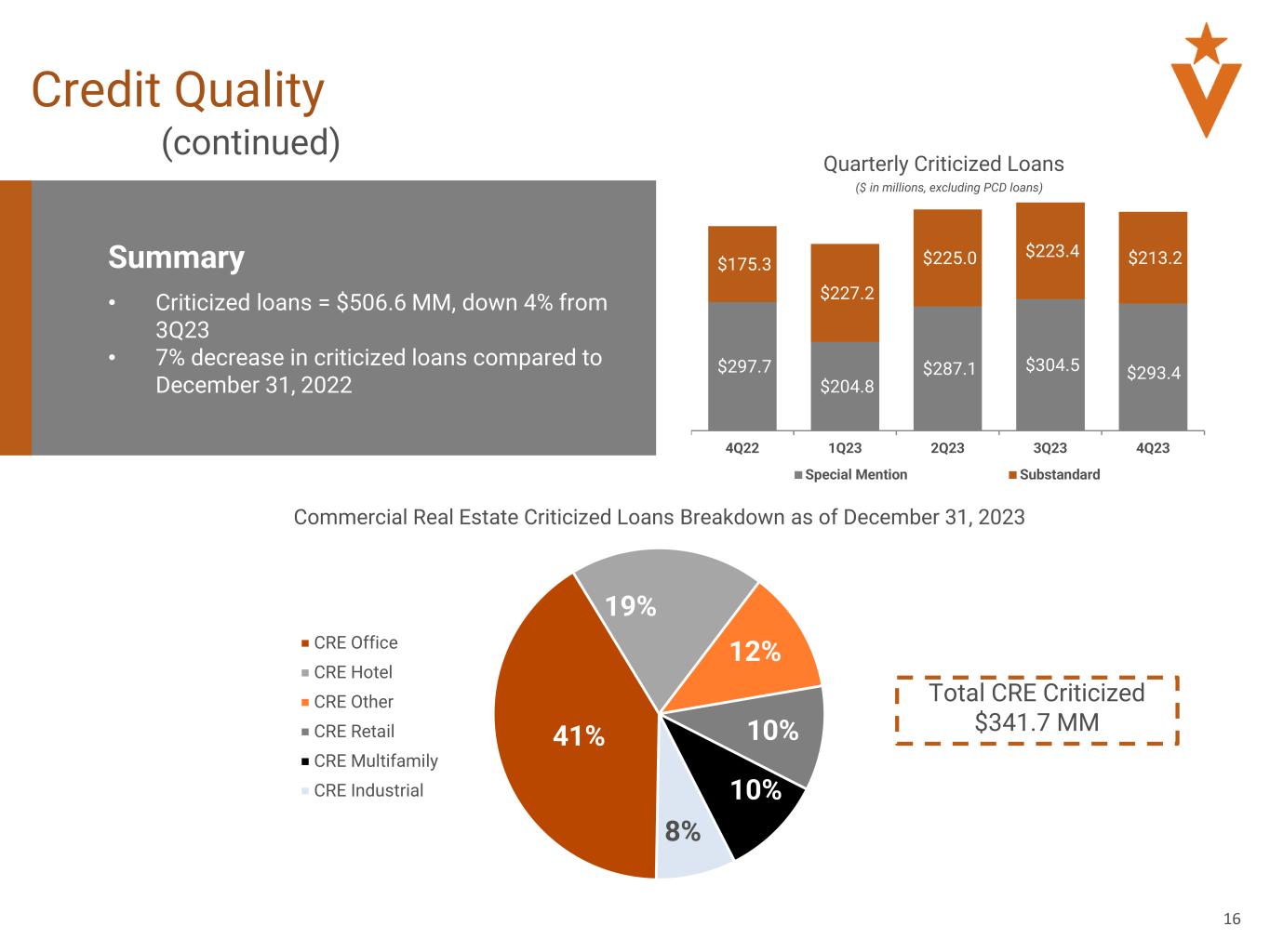 15 Credit Quality Summary • 2023 net charge-offs were 0.25% • 5 -year average net charge-offs were 0.27% • 5 -year average originated net charge-offs were 0.06% • NPA / Total Assets increased to 0.77% driven primarily by previously acquired loans that moved to nonaccrual status during the fourth quarter • 60% of NCOs for the 2023 are related to two CRE Office relationships 4Q22 1Q23 2Q23 3Q23 4Q23 0.00% 0.10% 0.20% 0.30% 30-59 Past Due 60-89 Past Due 90+ Past Due 0.19% 0.36% 0.29% 0.16% 0.04% 0.00% 0.00% 0.09% 0.00% 0.21% 2019 2020 2021 2022 2023 Acquired NCOs Originated NCOs Totals: $21,468 $15,287 $25,188 $27,158 $60,459 Past Due Trend1 % of Total Loans2 5 Year Net Charge-off Lookback ($ in millions) ($ in millions) $43.6 $44.5 $68.3 $79.9 $95.8 0.36% 0.35% 0.55% 0.65% 0.77% 0.0% 0.1% 0.2% 0.3% 0.4% 0.5% 0.6% 0.7% 0.8% 4Q22 1Q23 2Q23 3Q23 4Q23 NPAs NPAs/Total Assets NPAs / Total Assets NPAs include $13.7 million of PCD loans at 4Q23 1 Past due loans exclude purchased credit deteriorated loans that are accounted for on a pooled basis and non-accrual loans. 2 Total loans excludes Loans Held for Sale, MW and PPP loans. Totals: 0.19% 0.36% 0.38% 0.16% 0.25% 72% of net charge-offs for the previous 5 years are from acquired credits