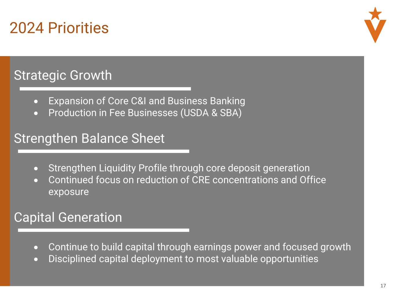 17 2024 Priorities Strategic Growth • Expansion of Core C&I and Business Banking • Production in Fee Businesses (USDA & SBA) Strengthen Balance Sheet • Strengthen Liquidity Profile through core deposit generation • Continued focus on reduction of CRE concentrations and Office exposure Capital Generation • Continue to build capital through earnings power and focused growth • Disciplined capital deployment to most valuable opportunities