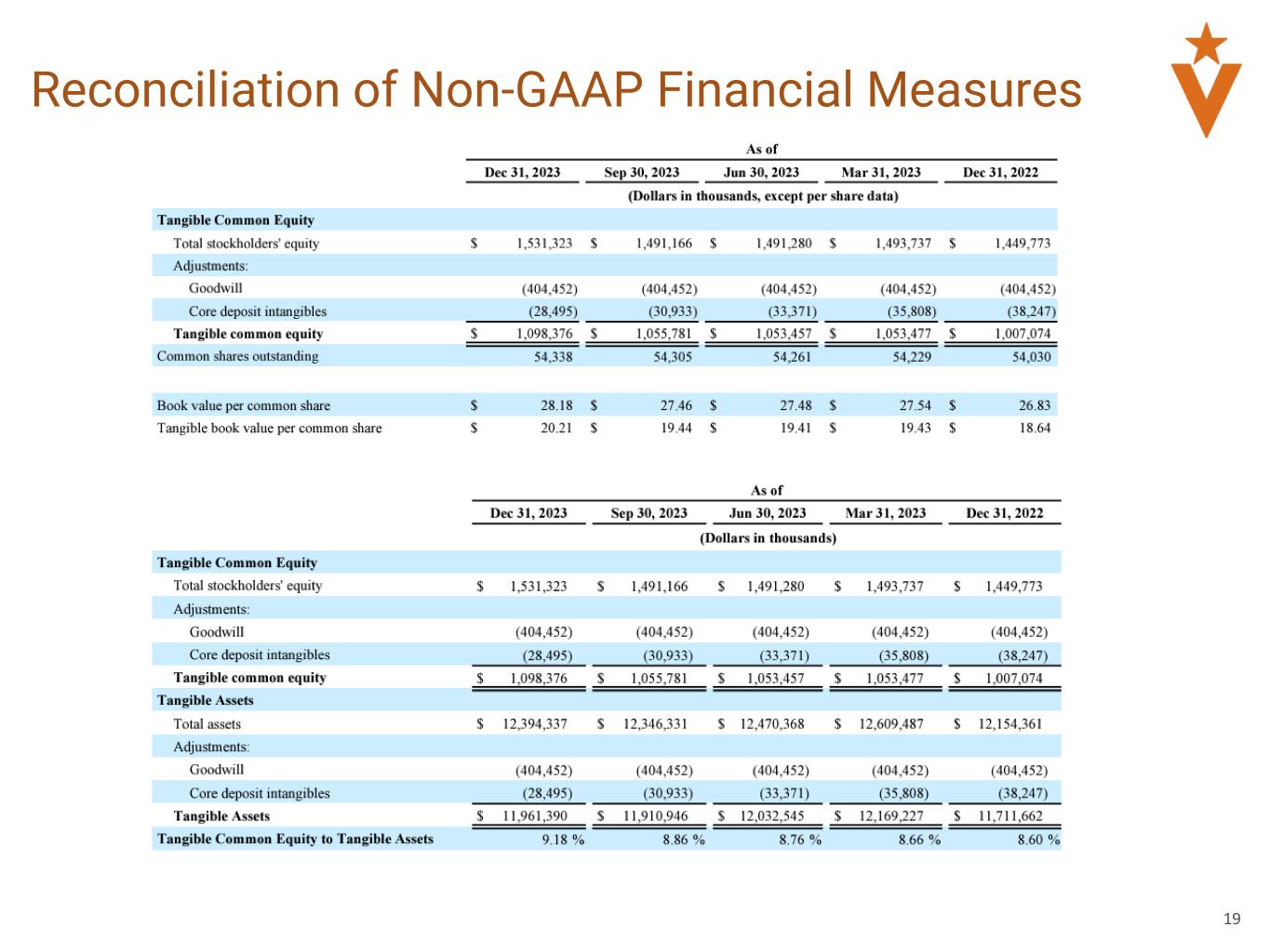 Tangible Common Equity to Tangible Assets. Tangible common equity to tangible assets is a non-GAAP measure generally used by financial analysts and investment bankers to evaluate financial institutions. We calculate: (a) tangible common equity as total stockholders’ equity, less goodwill and core deposit intangibles, net of accumulated amortization; (b) tangible assets as total assets less goodwill and core deposit intangibles, net of accumulated amortization; and (c) tangible common equity to tangible assets as tangible common equity (as described in clause (a)) divided by tangible assets (as described in clause (b)). For tangible common equity to tangible assets, the most directly comparable financial measure calculated in accordance with GAAP is total stockholders’ equity to total assets.