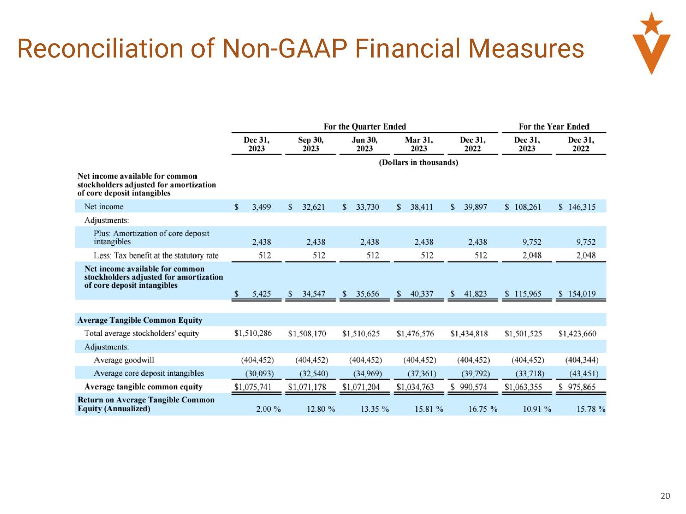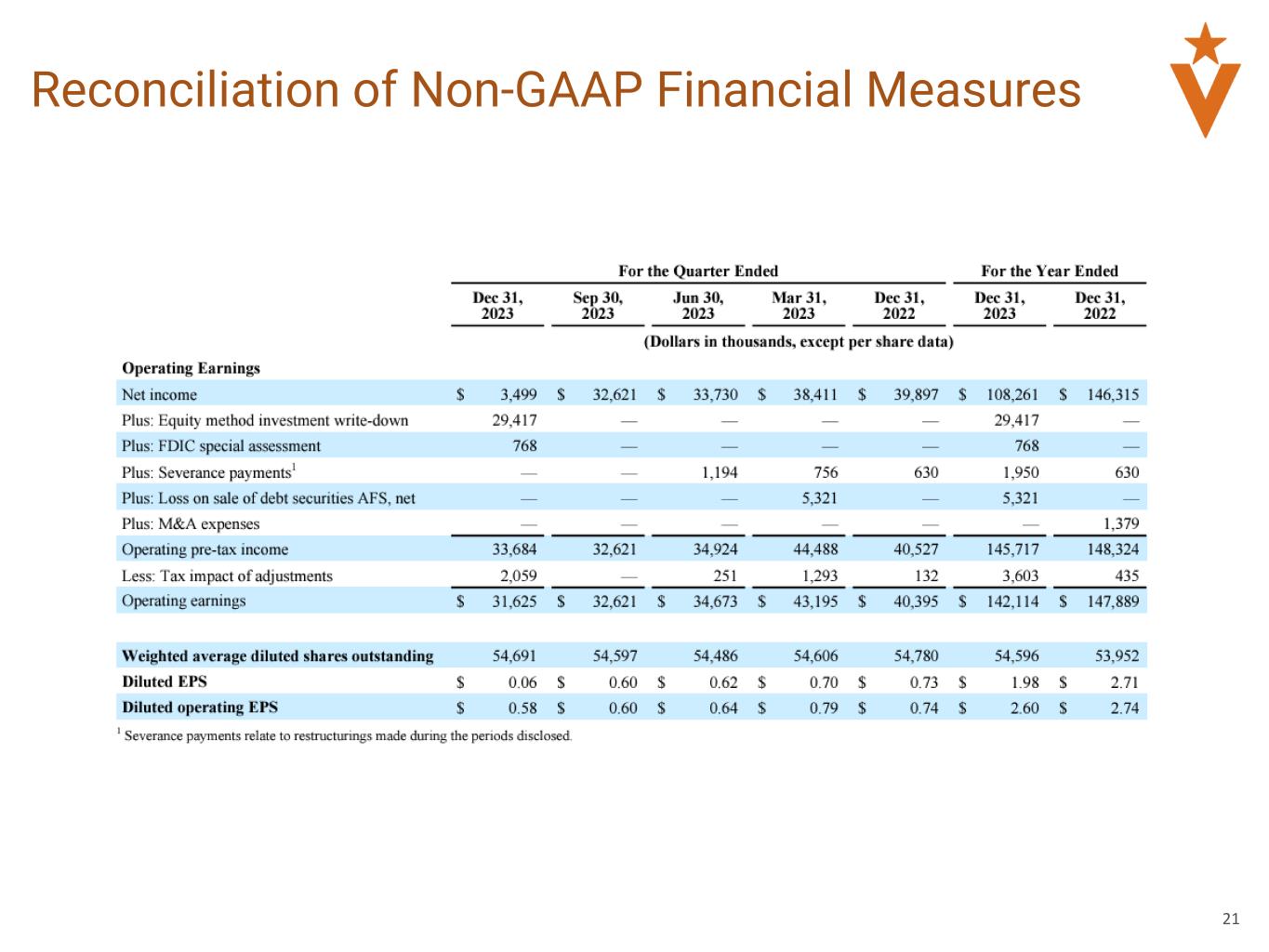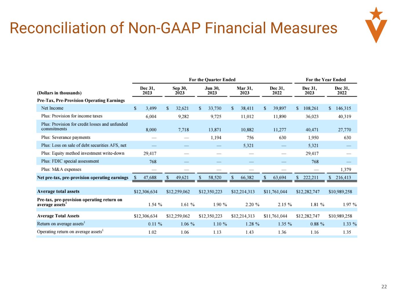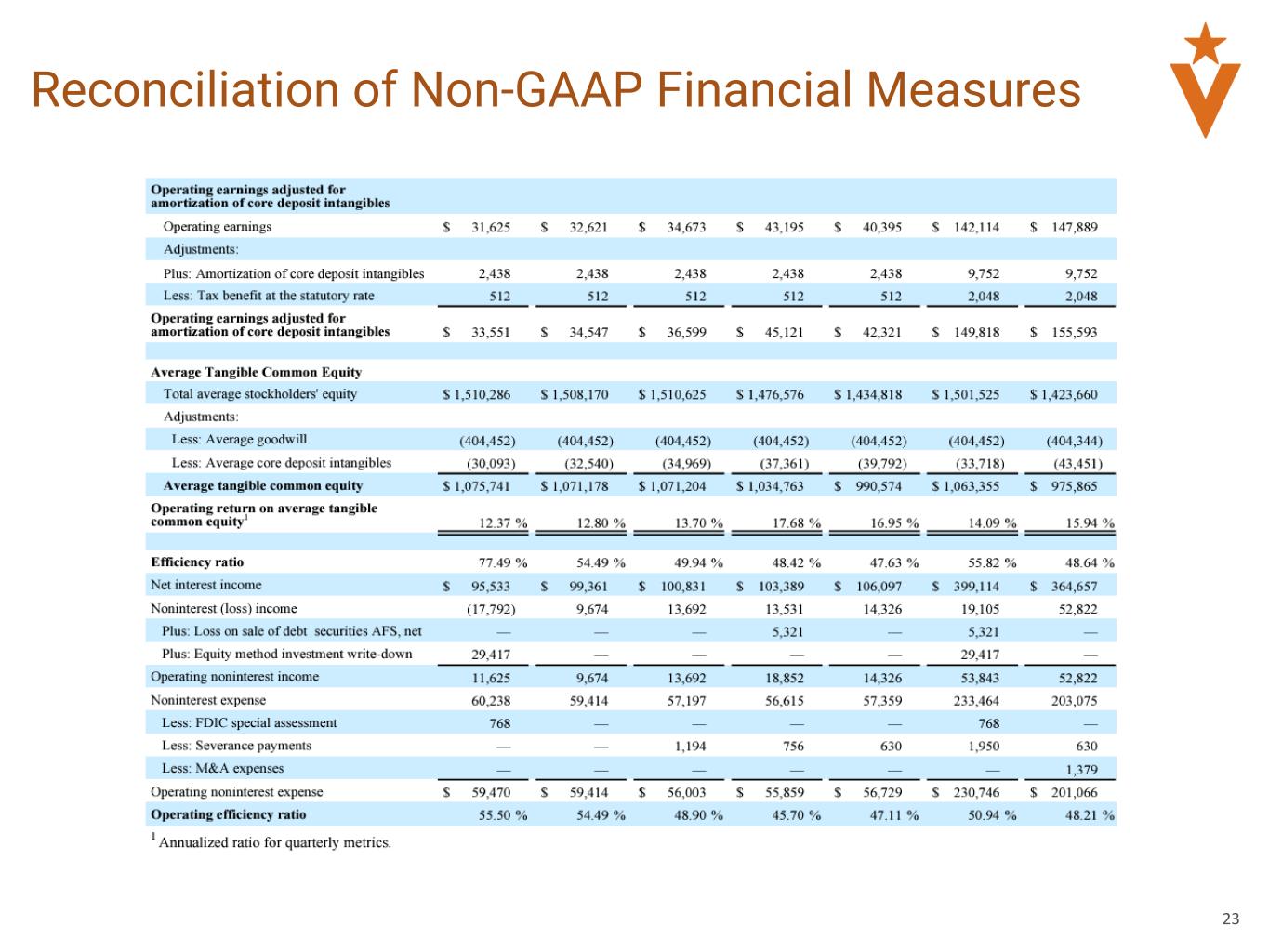 Operating Earnings, Pre-tax, Pre-provision Operating Earnings and performance metrics calculated using Operating Earnings and Pre-tax, Pre-provision Operating Earnings, including Diluted Operating Earnings per Share, Operating Return on Average Assets, Pre-tax, Pre-Provision Operating Return on Average Assets, Operating Return on Average Assets, Pre-tax, Pre-Provision Operating Return on Average Assets, Pre-tax, Pre-Provision Operating Return on Average Loans, Operating Return on Average Tangible Common Equity and Operating Efficiency Ratio. Operating earnings, pre-tax, pre-provision operating earnings and the performance metrics calculated using these metrics, listed below, are non-GAAP measures used by management to evaluate the Company’s financial performance. We calculate (a) operating earnings as net income plus equity method investment write-down, plus FDIC special assessment, plus severance payments, plus loss on sale of debt securities AFS, net, plus M&A expenses less tax impact of adjustments, plus nonrecurring tax adjustments. We calculate (b) diluted operating earnings per share as operating earnings as described in clause (a) divided by weighted average diluted shares outstanding. We calculate (c) pre-tax, pre-provision operating earnings as operating earnings as described in clause (a) plus provision for income taxes, plus benefit (provision) for credit losses and unfunded commitments. We calculate (d) pre-tax, pre-provision operating return on average assets as pre-tax, pre-provision operating earnings as described in clause (a) divided by total average assets. We calculate (e) operating return on average assets as operating earnings as described in clause (a) divided by total average assets. We calculate (f) operating return on average tangible common equity as operating earnings as described in clause (a), adjusted for the amortization of intangibles and tax benefit at the statutory rate, divided by total average tangible common equity (average stockholders’ equity less average goodwill and average core deposit intangibles, net of accumulated amortization). We calculate (g) operating efficiency ratio as noninterest expense plus adjustments to operating noninterest expense divided by noninterest income plus adjustments to operating noninterest income, plus net interest income