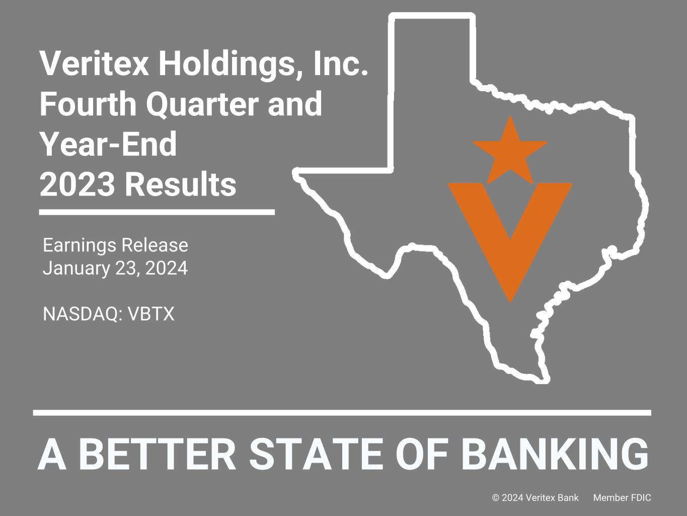 A BETTER STATE OF BANKING Earnings Release January 23, 2024 NASDAQ: VBTX Veritex Holdings, Inc. Fourth Quarter and Year-End 2023 Results © 2024 Veritex Bank Member FDIC