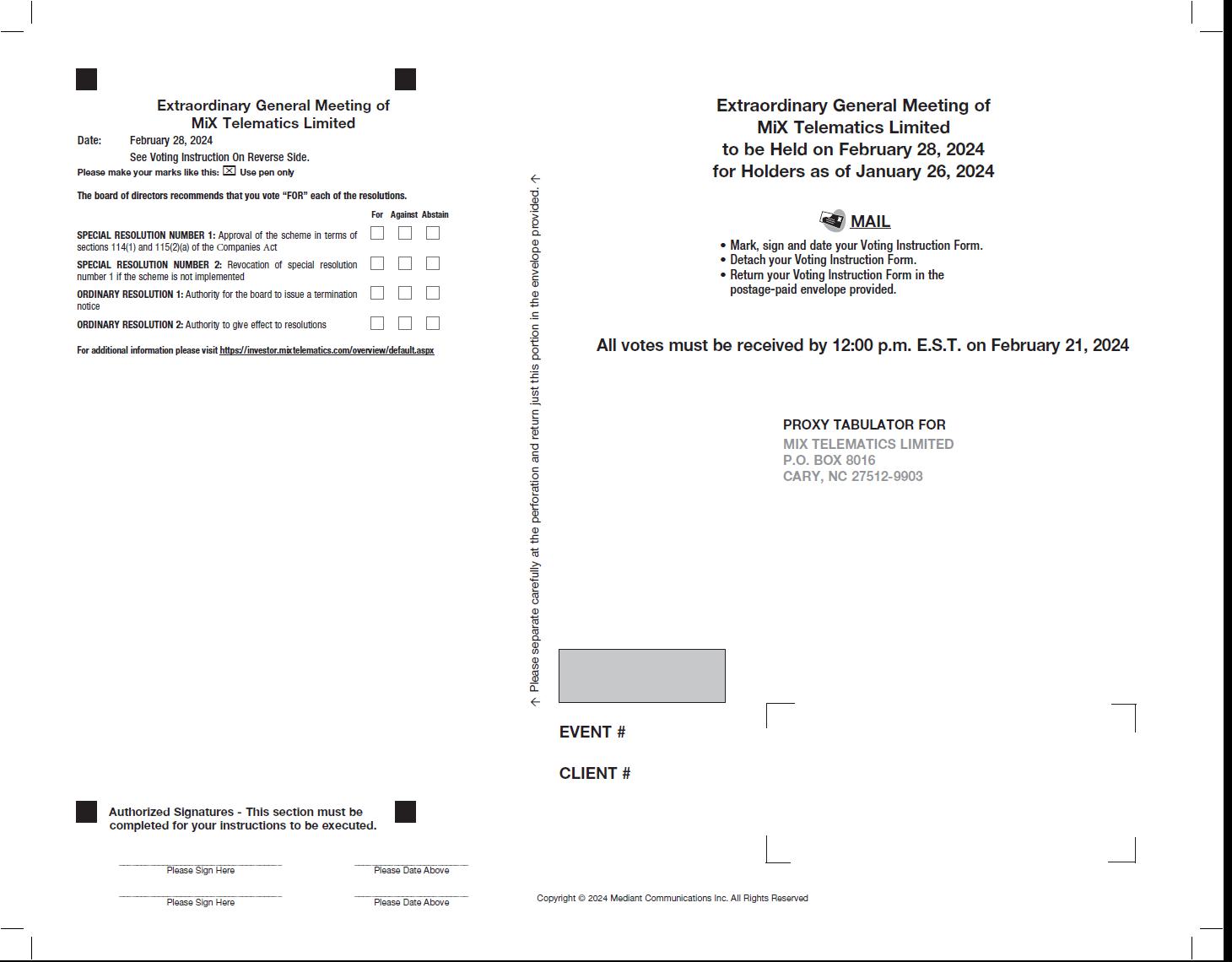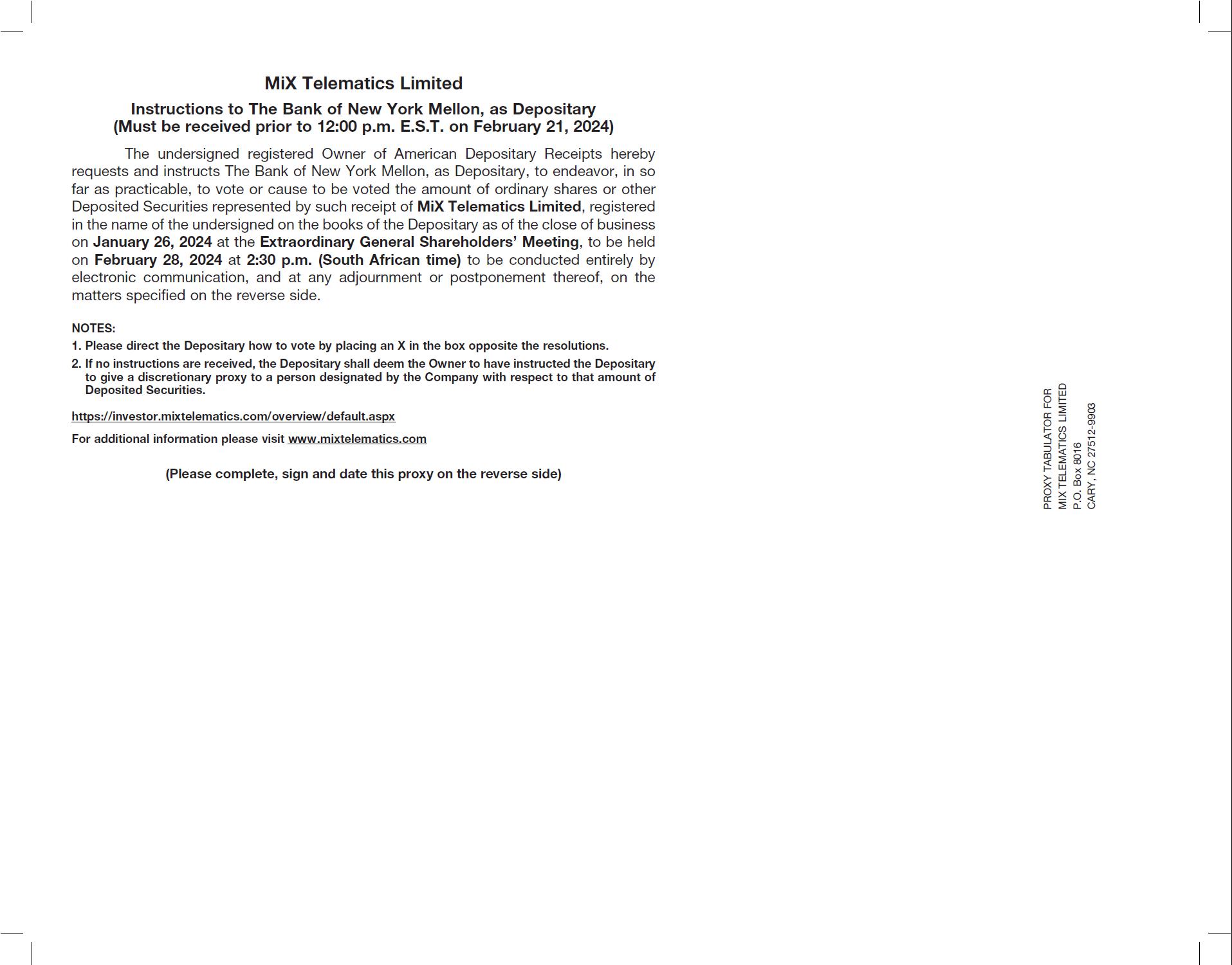 Holders of American Depositary Shares, each of which represents 25 MiX ordinary shares (“MiX ADSs”), may instruct The Bank of New York Mellon (the “depositary”), either directly or through their broker, bank or other securities intermediary, how to vote the MiX ordinary shares underlying their MiX ADSs. Please note that only MiX shareholders, and not holders of MiX ADSs (“MiX ADS holders”), are entitled to vote directly at the MiX extraordinary general meeting. The depositary has fixed a record date for the determination of MiX ADS holders who shall be entitled to give such voting instructions. MiX Telematics has been informed by the depositary that it has set the record date for MiX ADS holders with respect to the MiX extraordinary general meeting as January 26, 2024. So long as the depositary receives your voting instructions by 12:00 p.m., Eastern Time, on February 21, 2024, it will try, to the extent practicable and subject to South African law and the terms of the deposit agreement, to vote the underlying MiX ordinary shares as you instruct. If you wish to have your votes cast at the meeting as a MiX ADS holder, you must obtain, complete and timely return a voting instruction form from the depositary, if you are a registered MiX ADS holder, or from your broker, bank or other securities intermediary in accordance with any instructions provided therefrom.