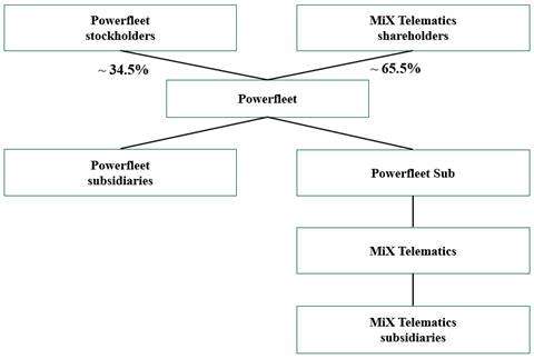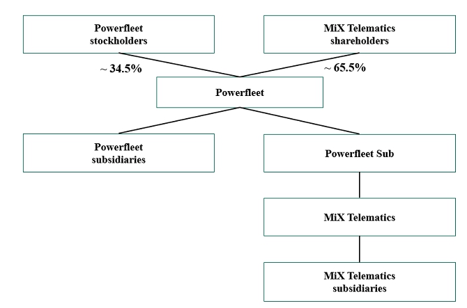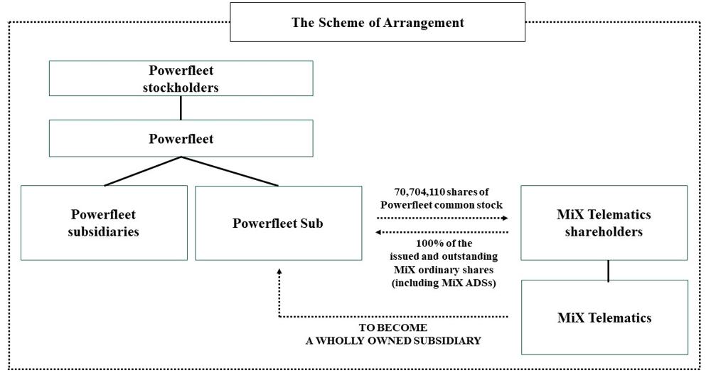 Following implementation of the scheme, Powerfleet stockholders will continue to own their existing shares of Powerfleet common stock. It is anticipated that Powerfleet securityholders will own approximately 34.5% and MiX Telematics securityholders (including holders of MiX ADSs) will own approximately 65.5% of the combined company on a fully diluted basis immediately following implementation of the scheme. Powerfleet common stock is traded on The Nasdaq Global Market (“Nasdaq”) under the symbol “PWFL.” MiX ordinary shares are traded on the JSE under the symbol “MIX” and MiX ADSs are traded on the New York Stock Exchange (the “NYSE”) under the symbol “MIXT.” The common stock of the combined company is expected to be remain listed on Nasdaq under the symbol “PWFL” and to be listed on the JSE under the symbol “PWR.”
