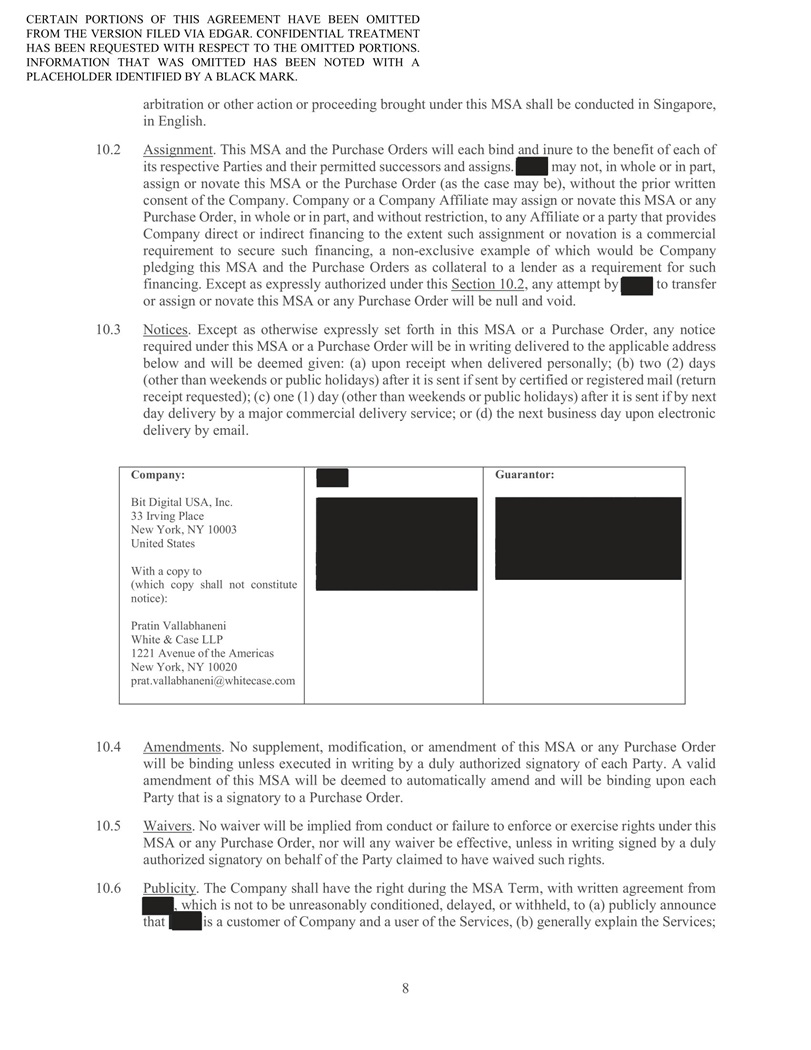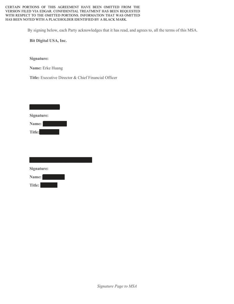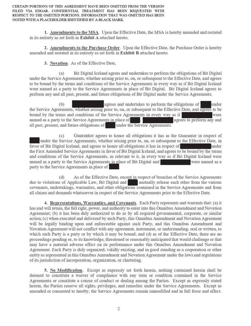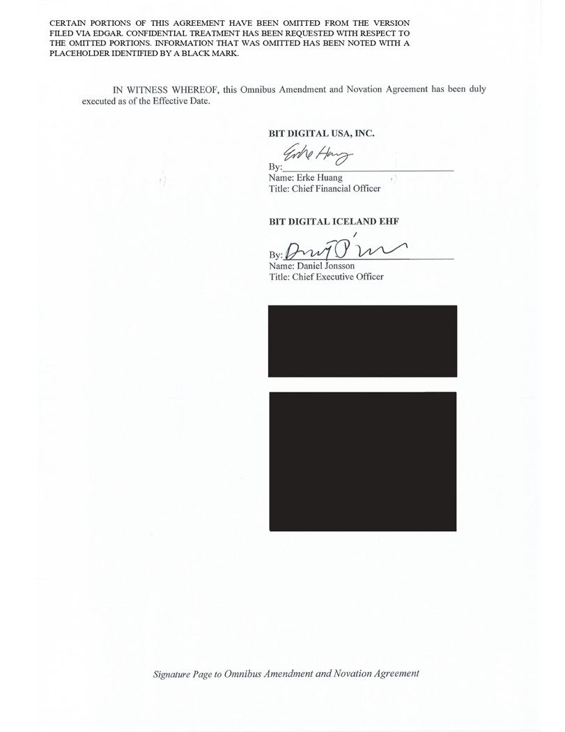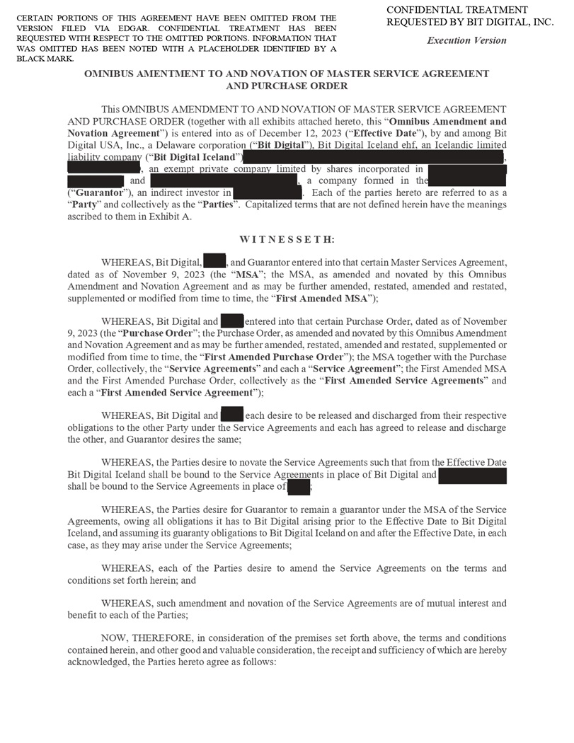 On December 12, 2023, Bit Digital, Inc. (the “Company”), through its subsidiaries, Bit Digital USA, Inc. and Bit Digital Iceland ehf, entered into an Omnibus Amendment to and Novation of Master Services Agreement and Purchase Order (the “Novation Agreement”) to amend and novate that certain Master Services Agreement and Purchase Order previously entered on November 9, 2023 (the “MSA”) with its first customer (the “Initial Customer”) and a guarantor of the Initial Customer (the “Guarantor”).