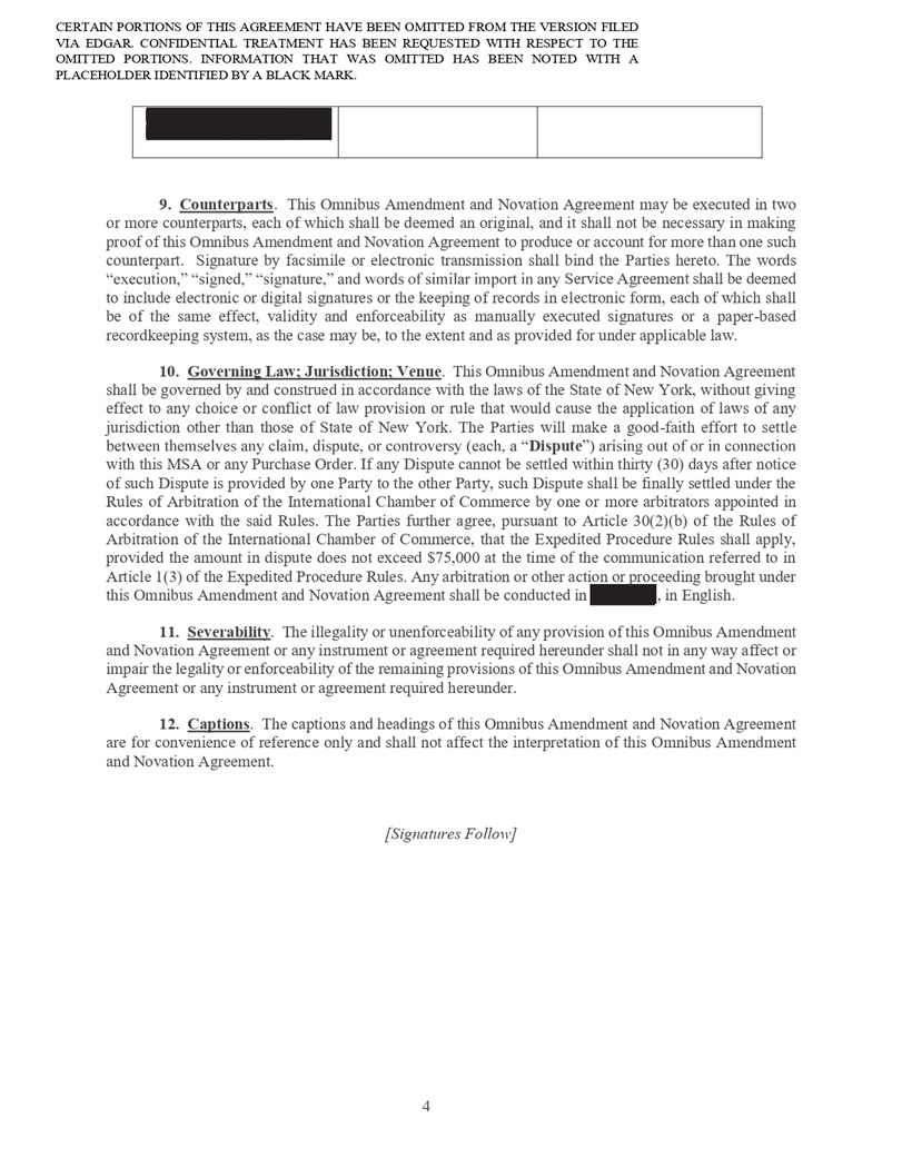 The foregoing summaries of the Novation Agreement, MSA and related agreements do not purport to be complete and are subject to, and qualified in their entirety by, such documents attached as Exhibits 4.1 and 4.2 to this Report on Form 6-K, which are incorporated herein by reference.